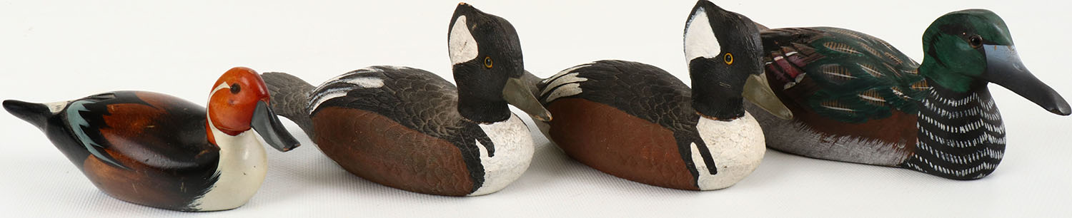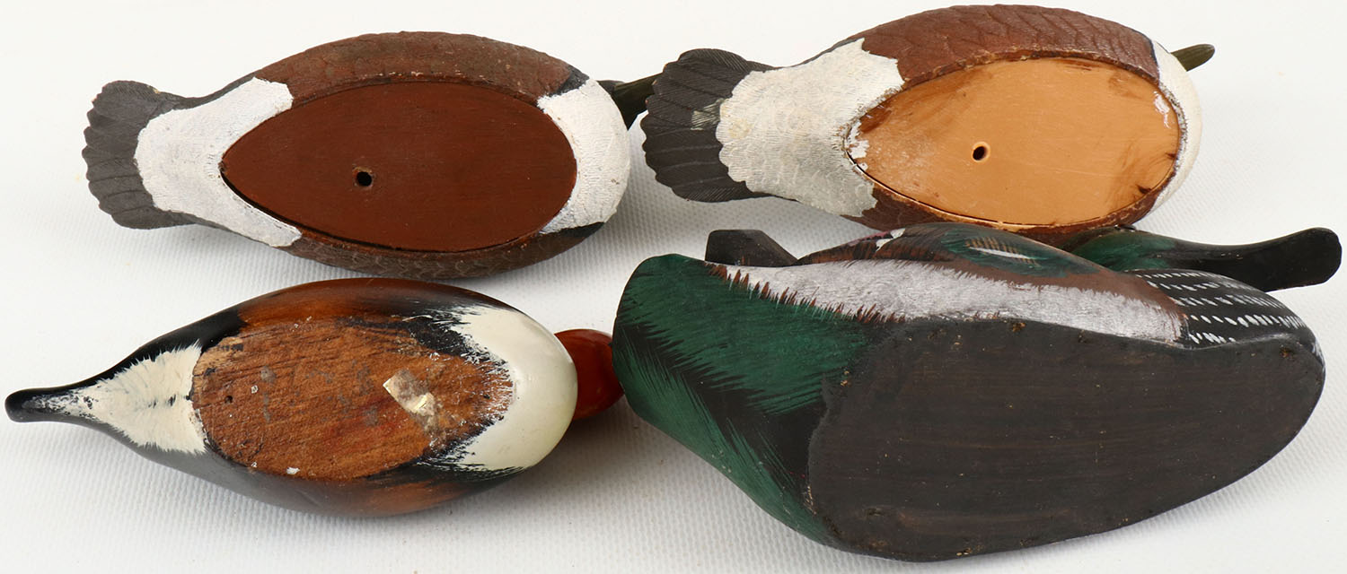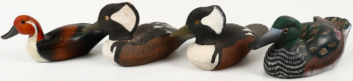 Lot of 4 miniature wood/plastic/ceramic or lead duck decoys by various cavers. ???? Grade: Excellent - Value: 10 to 50