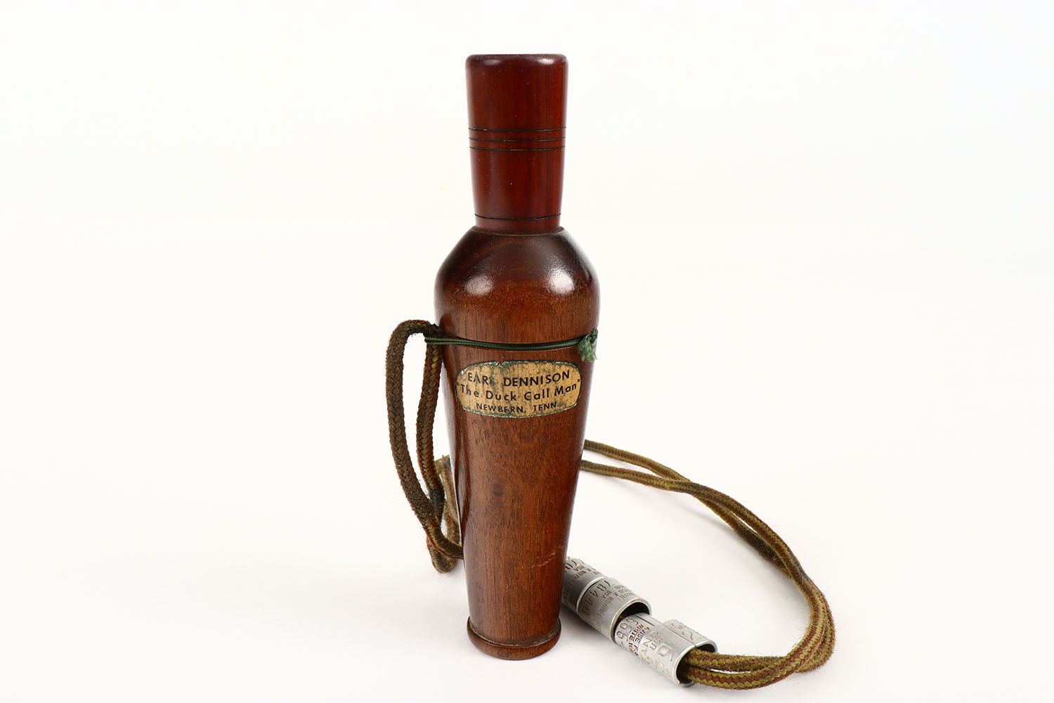 Earl Dennison Duck Call, Newbern, TN, ''The Duck Call Man'' label, sounds great, nice label shows some wear, has four duck bands on lanyard, well cared for. Grade: Excellent - Value: 50 to 250