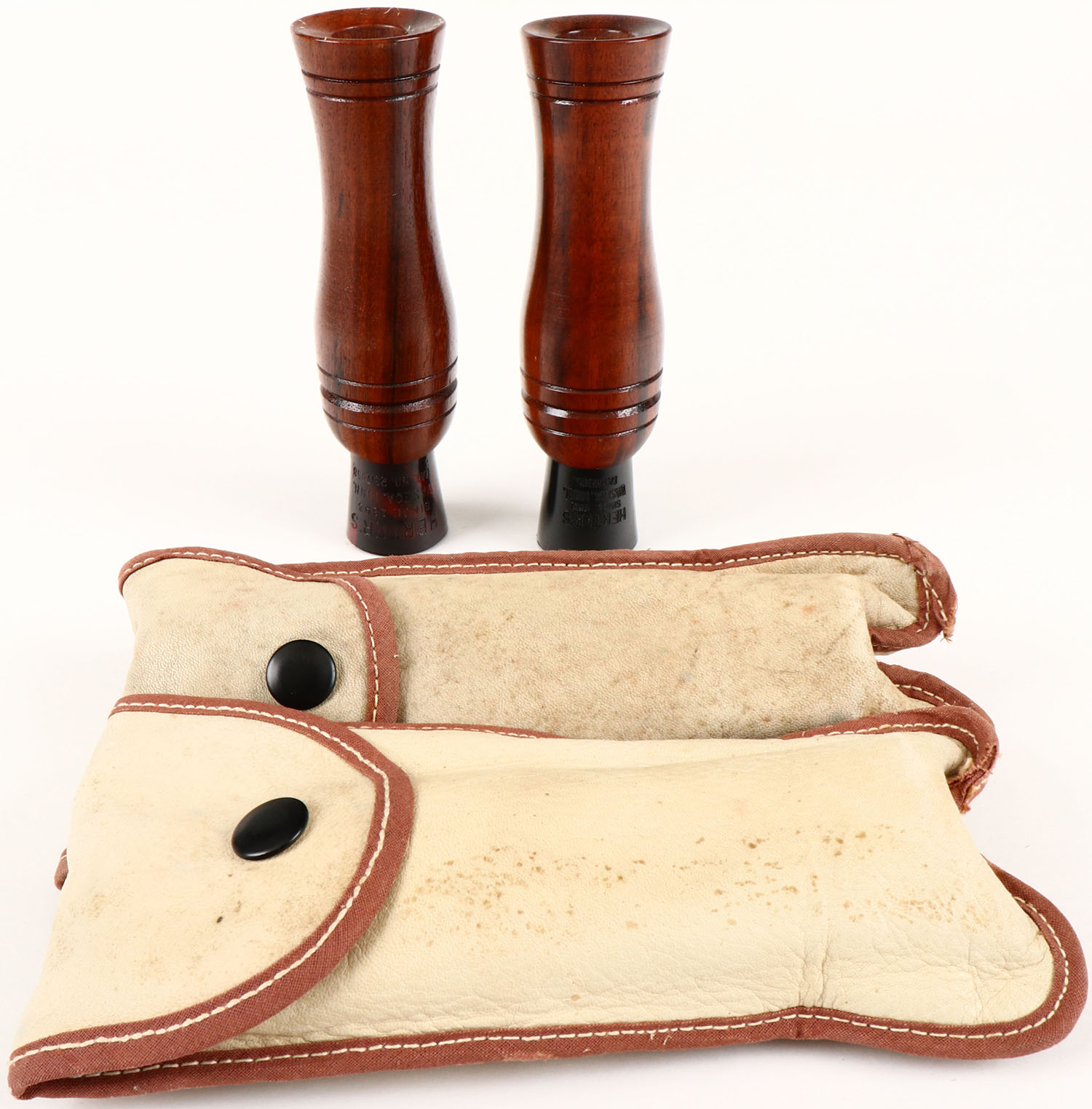Herters Rare Duck Call and Goose Call Matched Combination Call Kits. Duck No. C279 & Goose No. 379. Tigerwood Barrels with Herters Call Holsters. Ca. 1960s, Lodermeier Collection. Grade: Excellent + - Value: 30 to 200