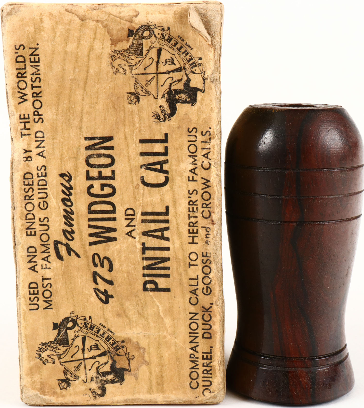 Herters Rare Early Widgeon Duck Call No. C473. Black Walnut Barrel made without stopper and plugged. Call & Box. Ca. 1947. Made for only 4 years, Lodermeier Collection. Grade: Excellent + - Value: 20 to 60