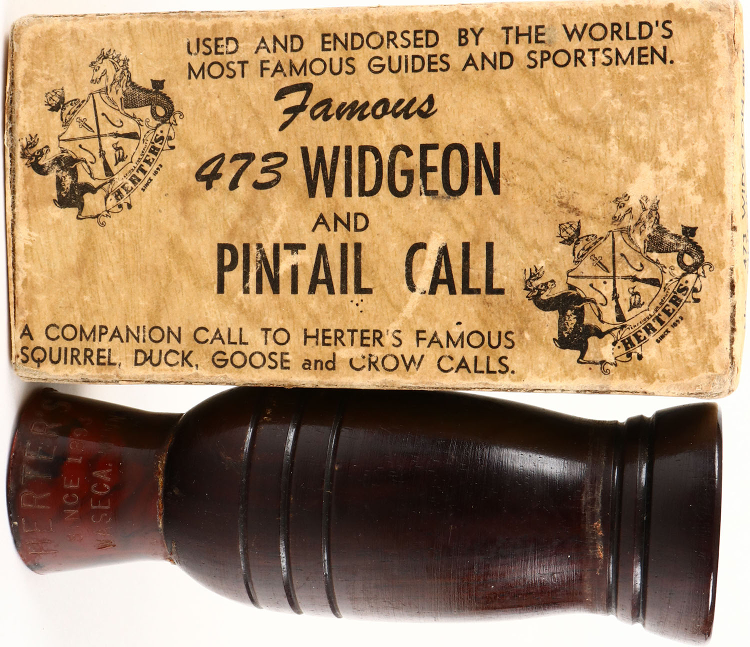 Herters Widgeon Duck Call No. C473. Black Walnut Barrel with Rare Rust & Black Swirl Stopper. Call, Box & Instructions. Ca. 1950s, Lodermeier Collection. Grade: Excellent + - Value: 20 to 60
