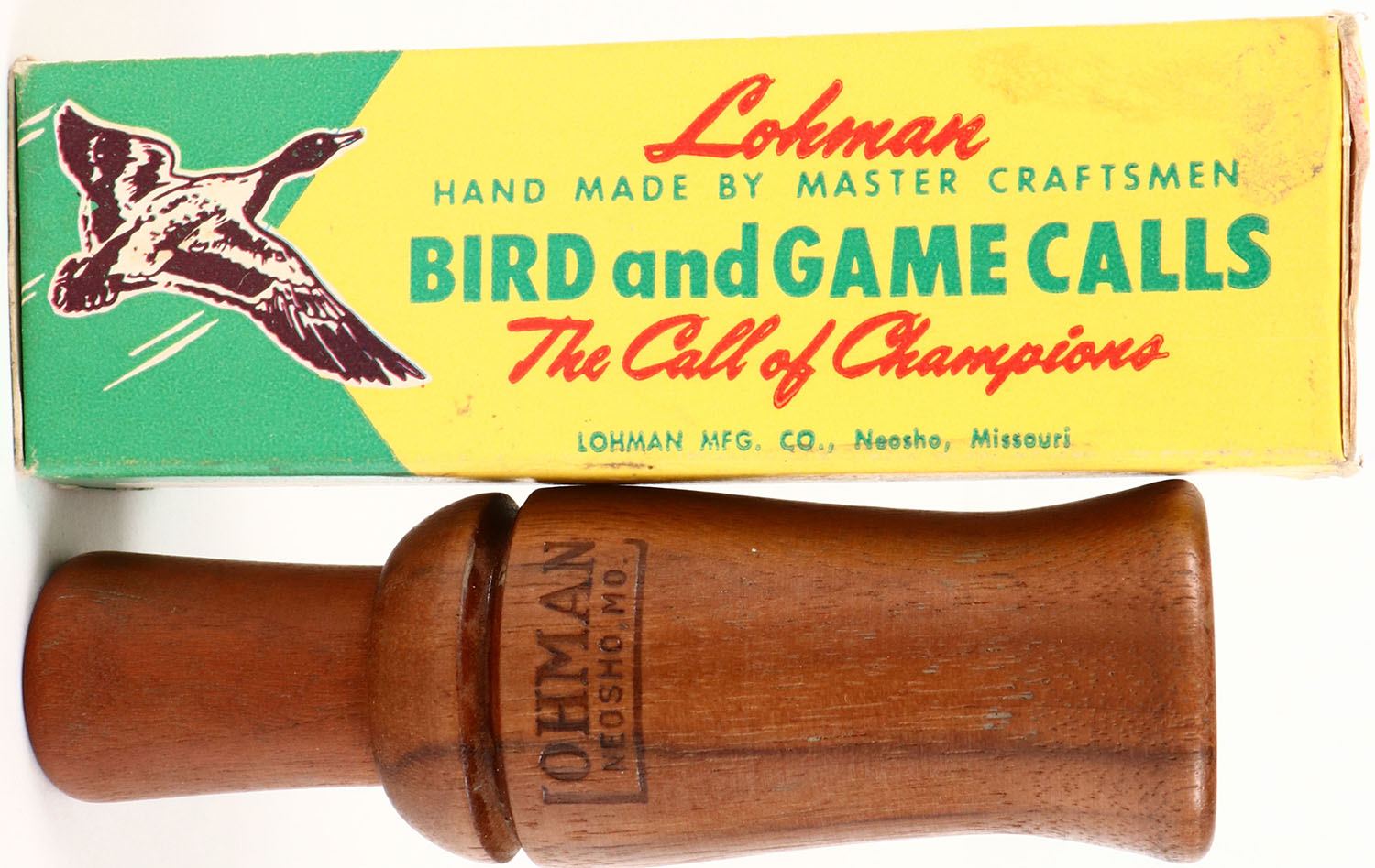 Lohman Goose Call, Neosho MO. Model No. 112, Marked on barrel, has original box & paperwork. Grade: Excellent ++ - Value: 10 to 30