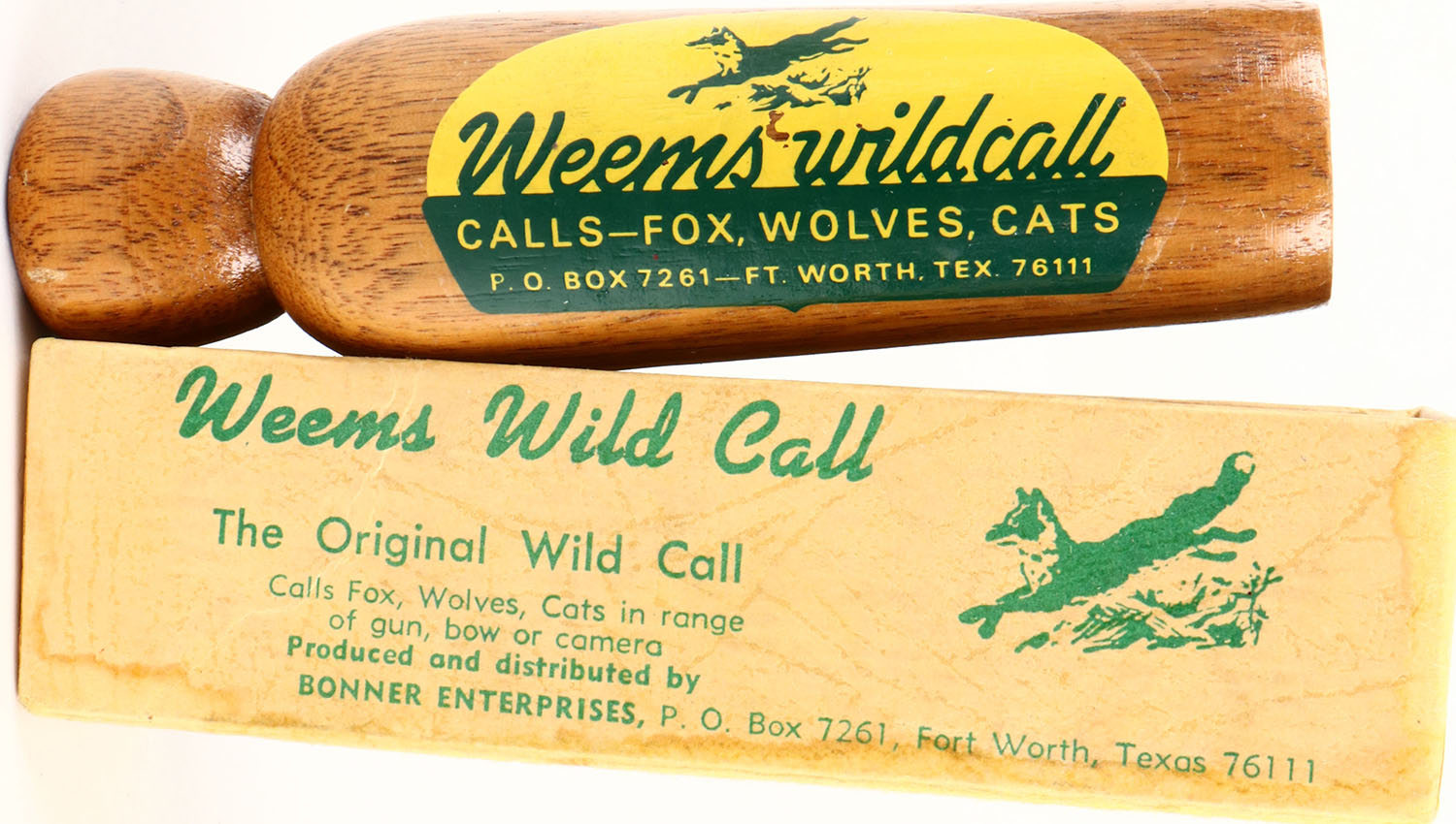 Weems Wild call Predator call, has yellow & green label, wood call is mint, box has no lid. Grade: Excellent ++ - Value: 10 to 40
