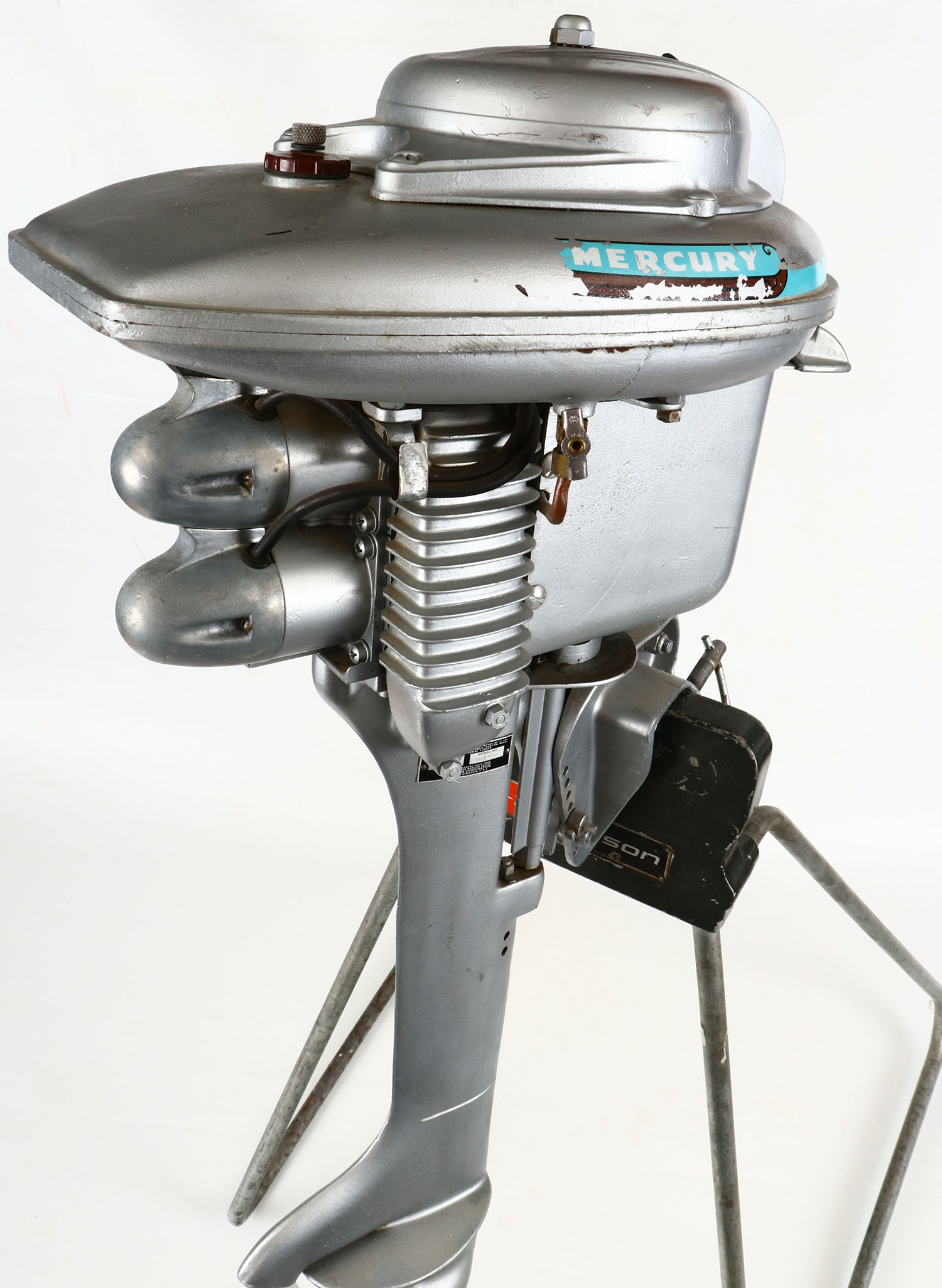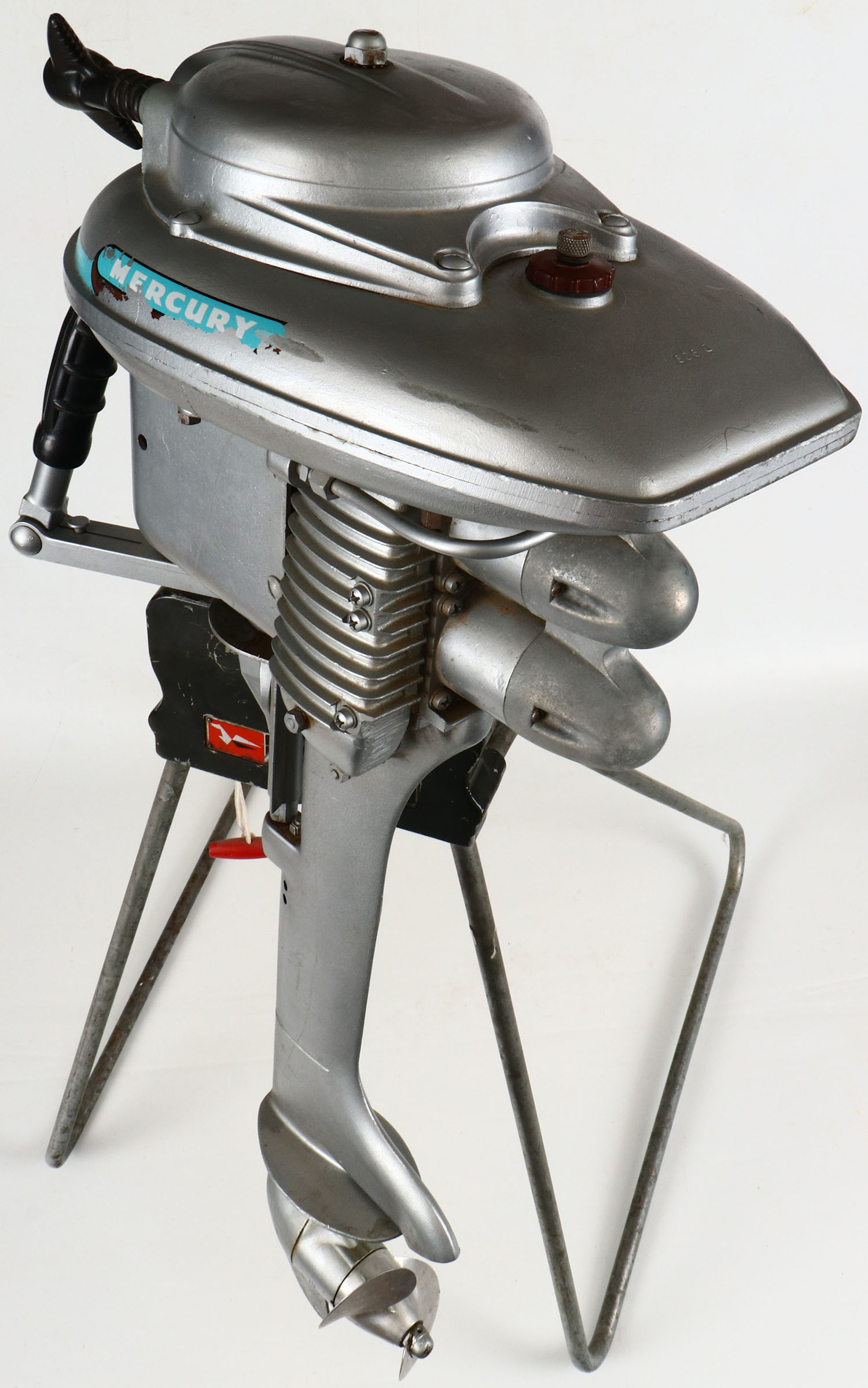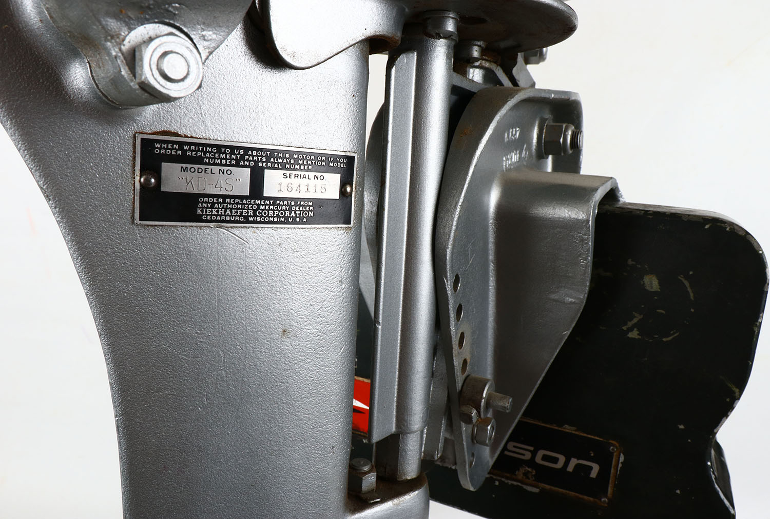 Mercury Outboard Motor, Model KD 4S, SN: 164???, HP 4-8?, has some original pin stripping, has original Model # tag, has Mercury logos, seams to rotate & may even function?, has Johnson Outboard Stand, the stand can be harder to find than the motor, stand has nice logo with some wear marks, motor stands about 40'' tall, nice and clean. Grade: Excellent - Value: 200 to 1200