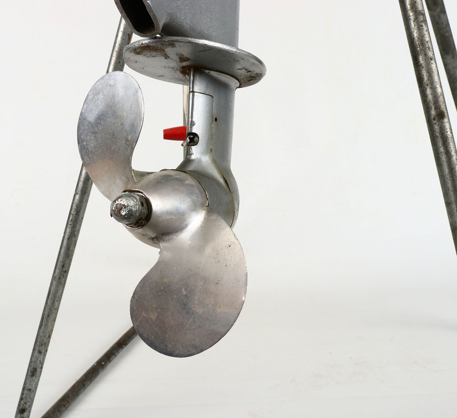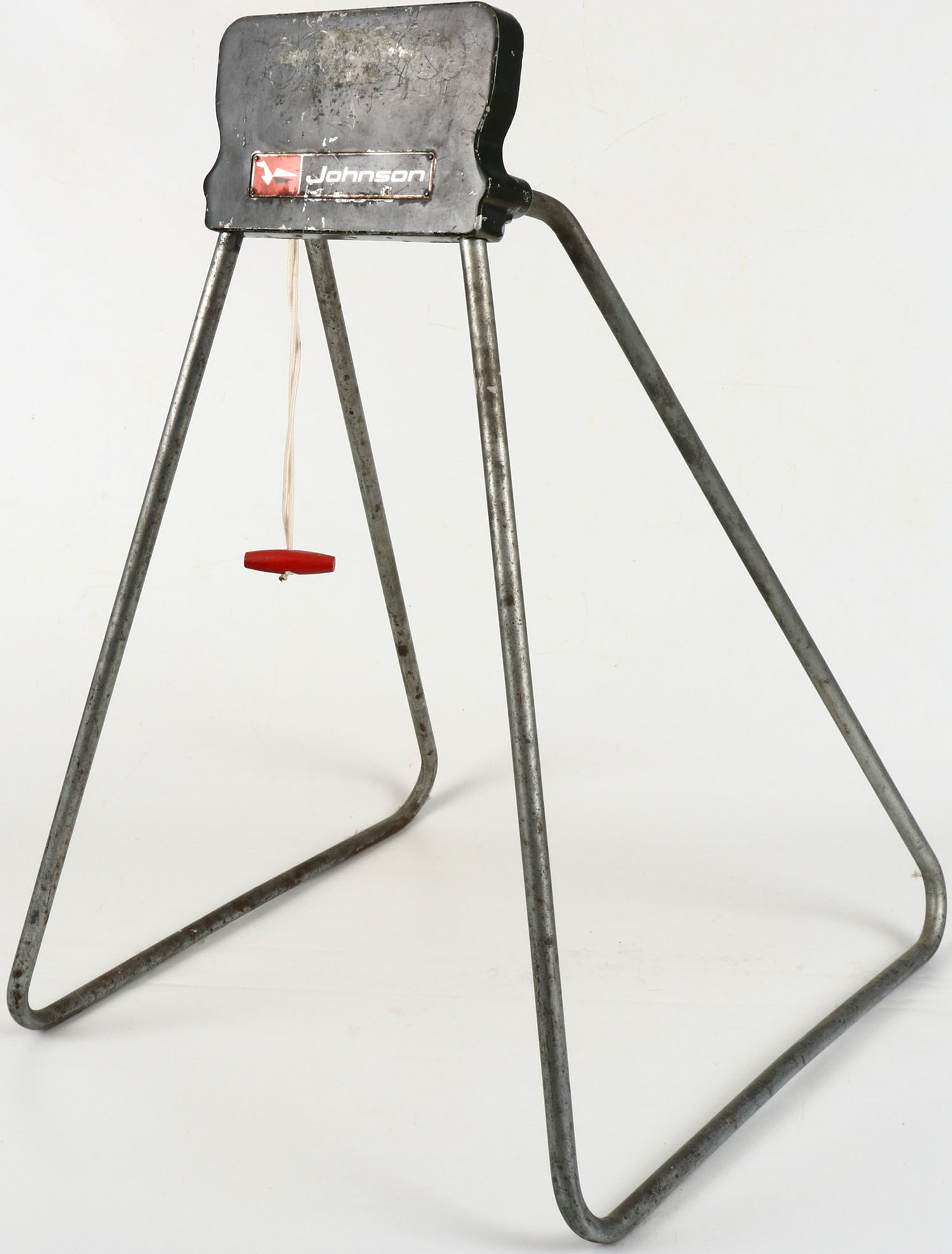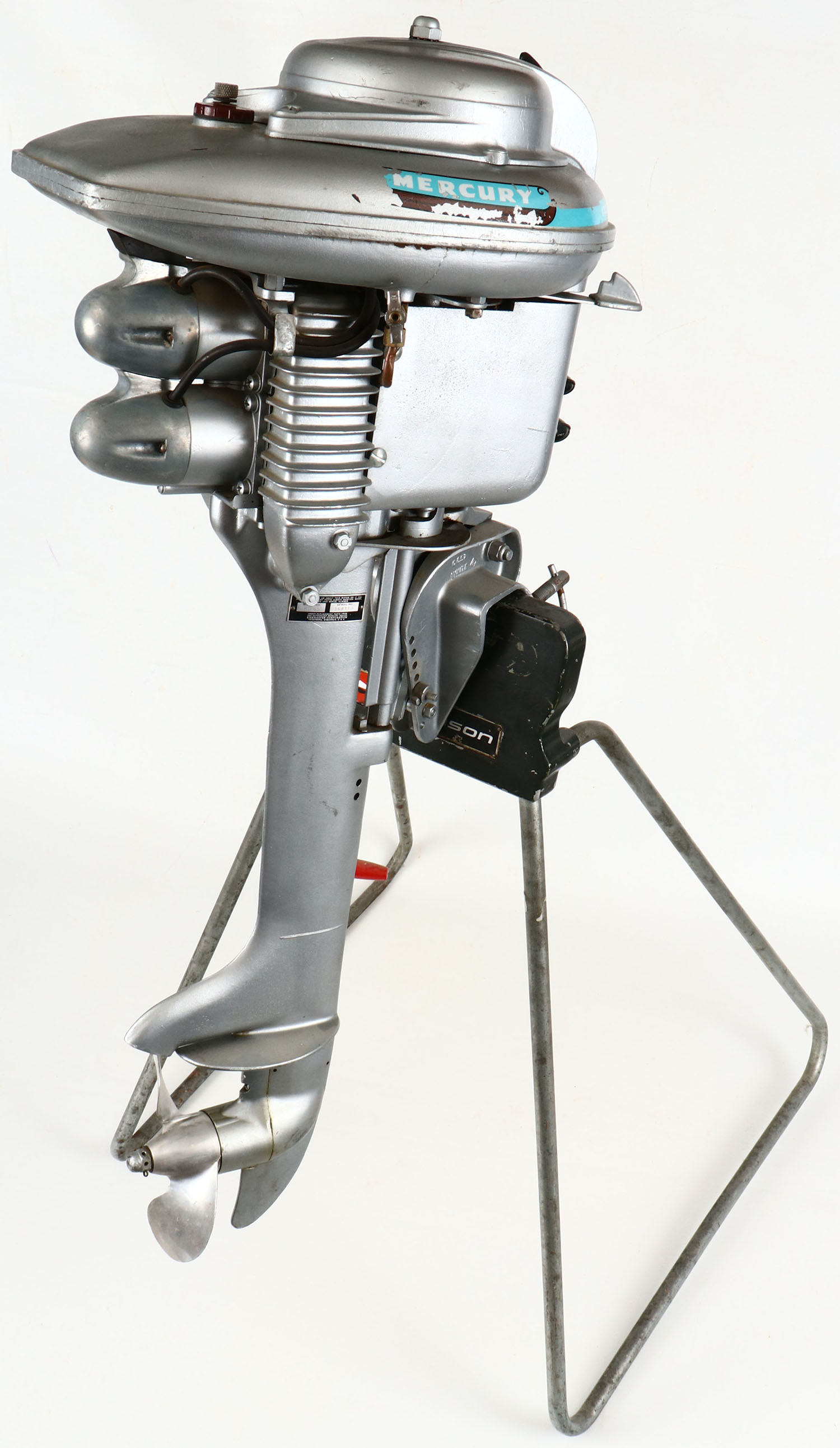 Mercury Outboard Motor, Model KD 4S, SN: 164???, HP 4-8?, has some original pin stripping, has original Model # tag, has Mercury logos, seams to rotate & may even function?, has Johnson Outboard Stand, the stand can be harder to find than the motor, stand has nice logo with some wear marks, motor stands about 40'' tall, nice and clean. Grade: Excellent - Value: 200 to 1200