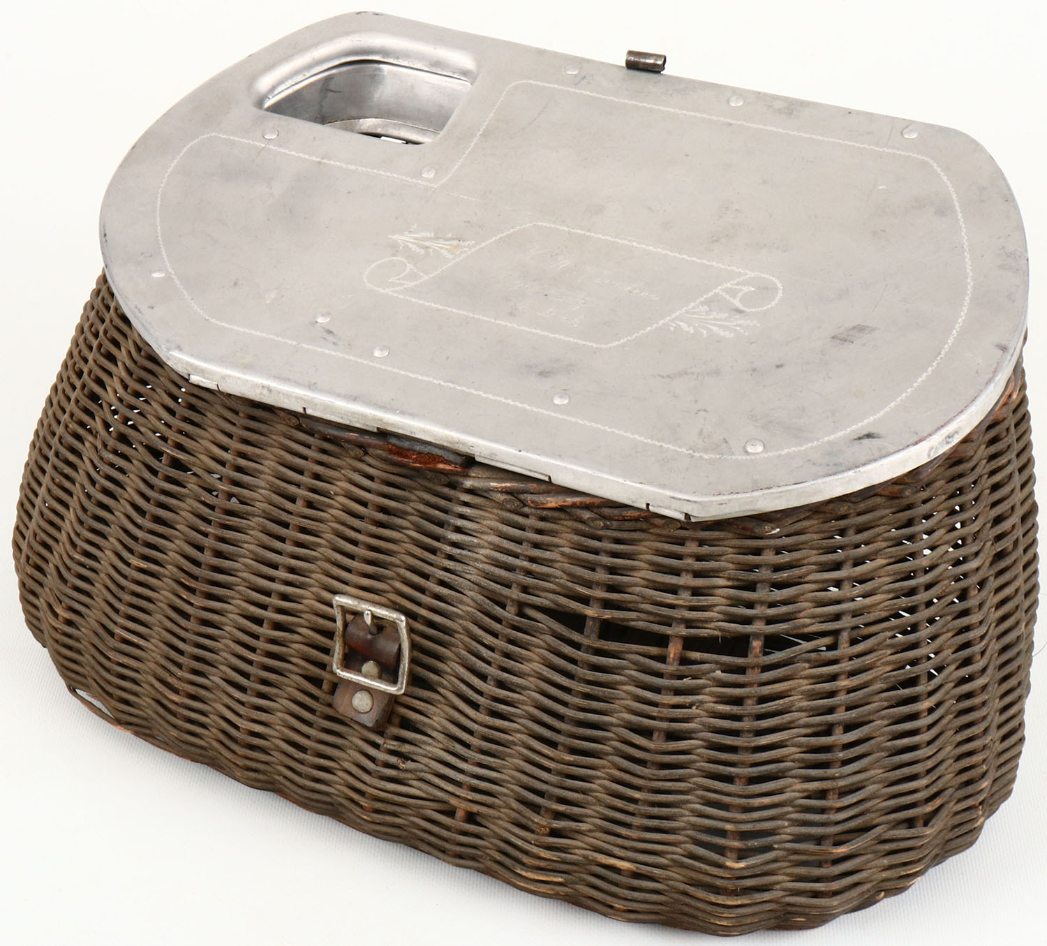 L. Quinn and Co. Fishing Creel, Milwaukee, WI, has nice metal top organizer lid, has many different compartments for lures, flies & hooks and they are all full, still has hole on top for the fish, 17'' at base, leather strap is broken, wicker basket is excellent, very nice collectible creel. Grade: Excellent - Value: 100 to 300
