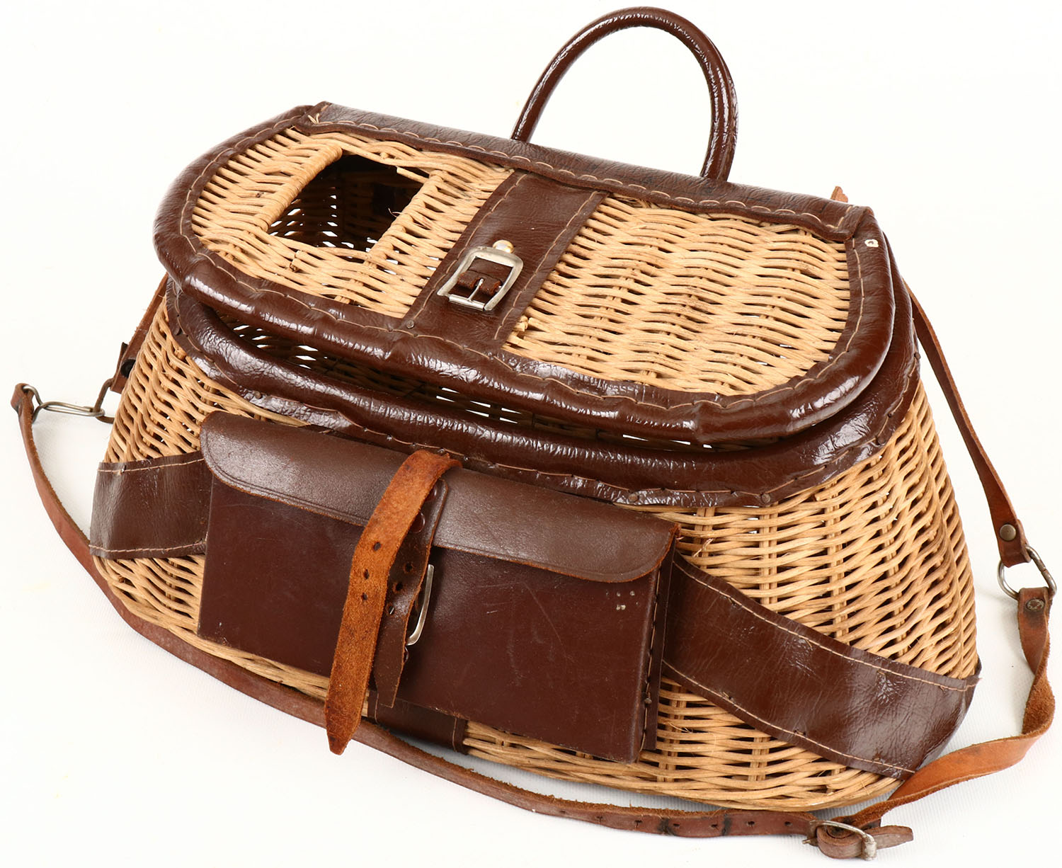 Fishing Creel with leather, 16'' at base, unmarked, all leather pocket, straps & carrying harnesses are very nice, wicker is excellent. Grade: Excellent + - Value: 30 to 100
