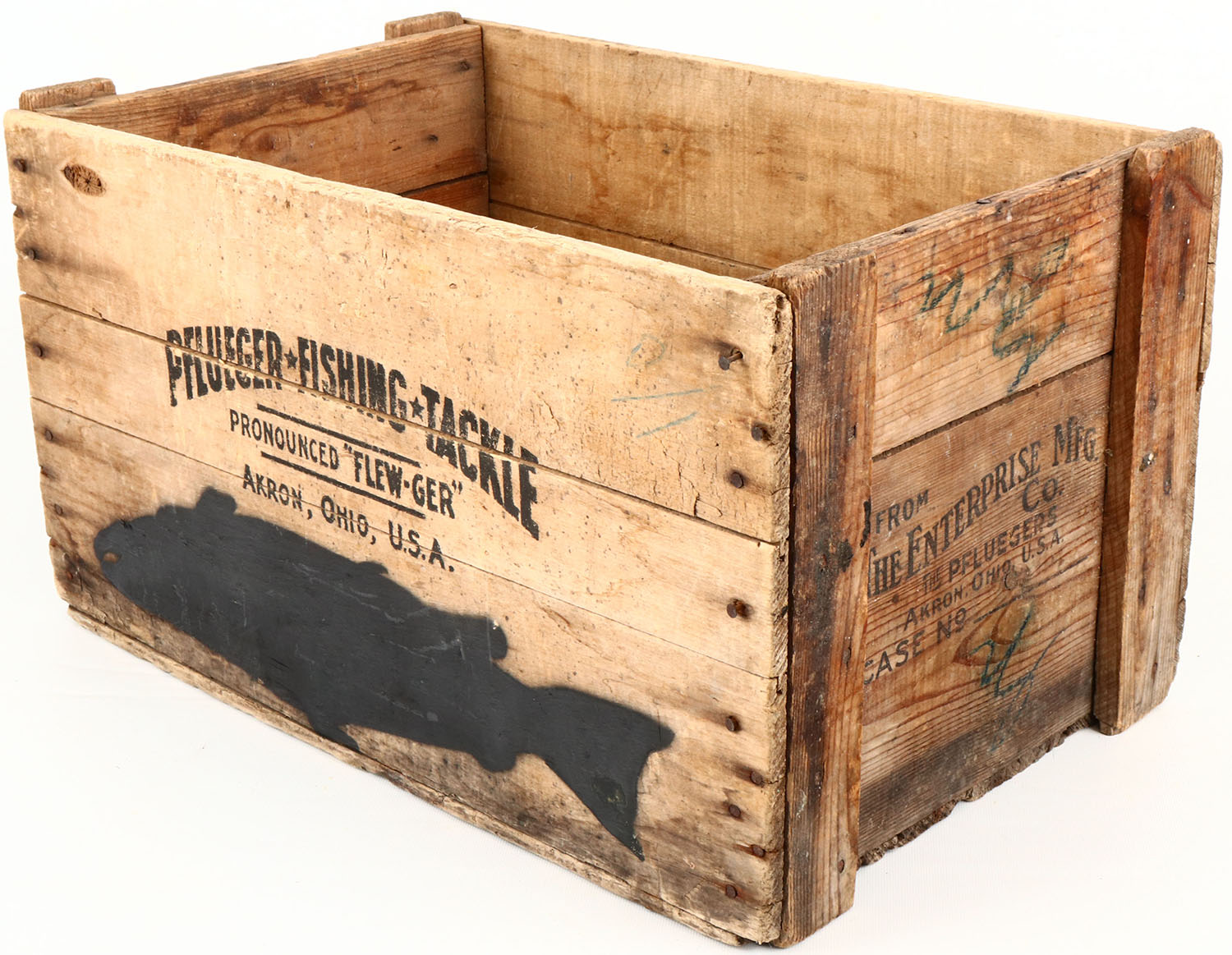 Pflueger Fishing Tackle Wood shipping crate, Pronounced ''FLEW=GER'', well marked on all sides, Case No. ______, 22 1/2'' x 14'' x 12''. Grade: Excellent ++ - Value: 50 to 250