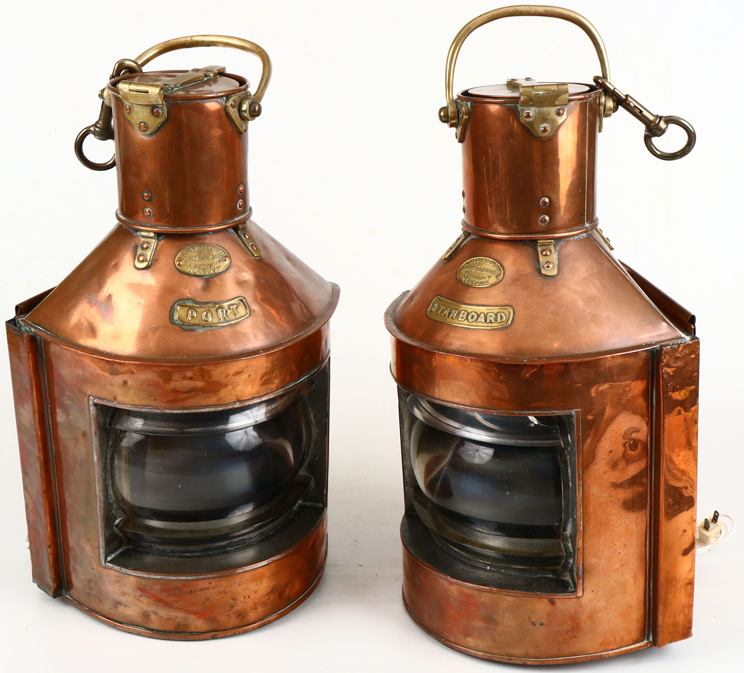 Pair of Bass & Copper lamps, made by Telford, Grier & Mackay LTD MFG, Glasgow, one marked PORT and one marked STARBOARD, wonderfully made early 1900's, 23'' tall x 10'' x 10'', fantastic condition, inside glass is colored red or green, lights do not work. Grade: Excellent ++ - Value: 1000 to 2000