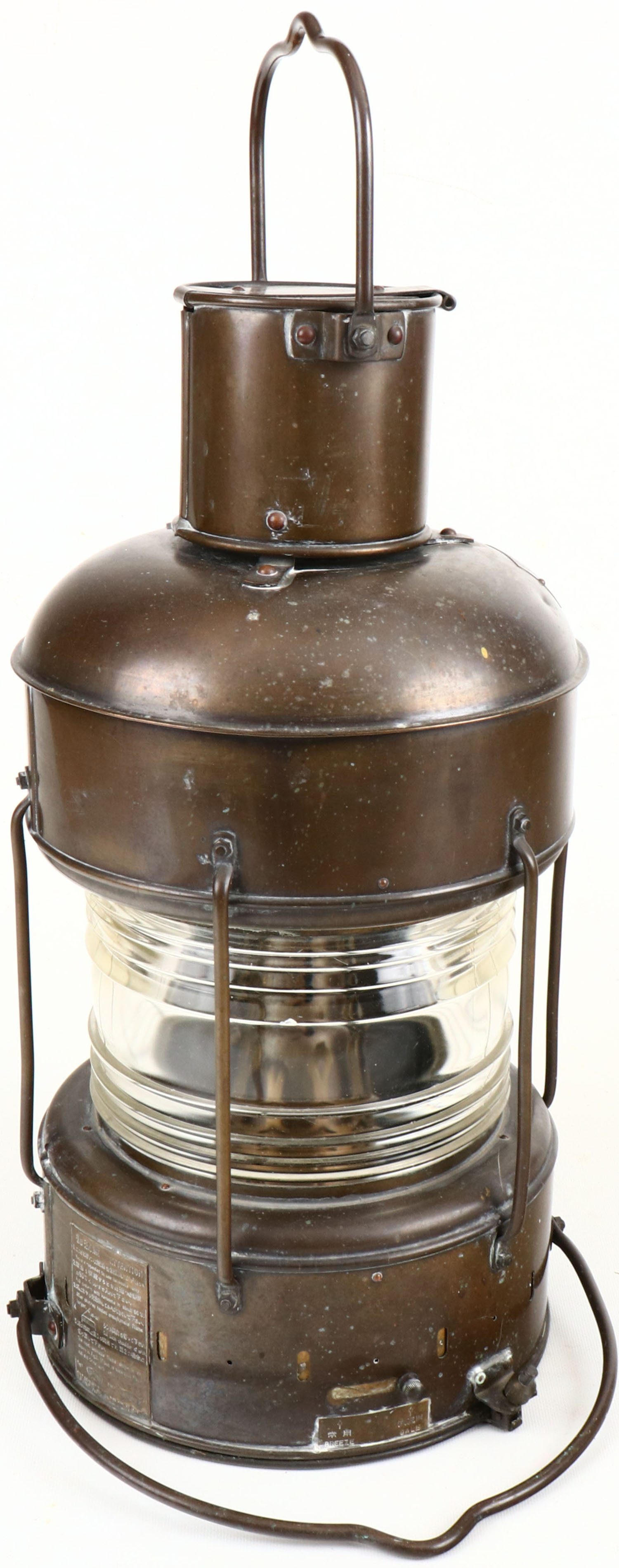 Nautical brass lamp with kerosene burner, has both Japanese & american print on brass instruction panel, 23'' tall x 10'' x 10'', lamp is in wonderful condition & may even work. Grade: Excellent - Value: 150 to 500