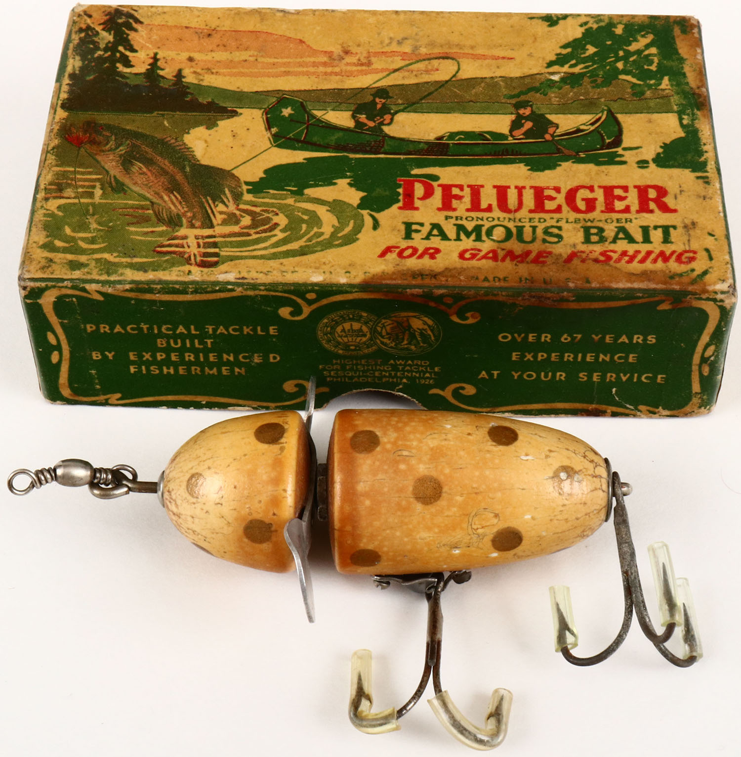 Pflueger Globe lure in the original box, 3770 LUM GOLD, no eyes, LUM GOLD finish, has spinner, 2 hook lure, lure & box shows age soiling, Rare Color. Grade: Very Good ++ - Value: 50 to 200