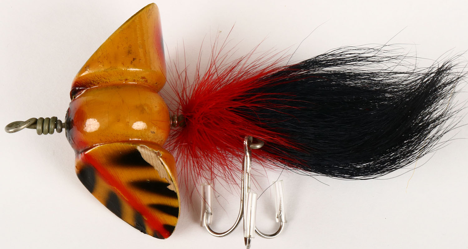 South Bend Whirl-Oreno lure, Rare Color Yellow with red & black stripes, has red & black hair skirt, single hook, very nice condition. Grade: Excellent + - Value: 100 to 300