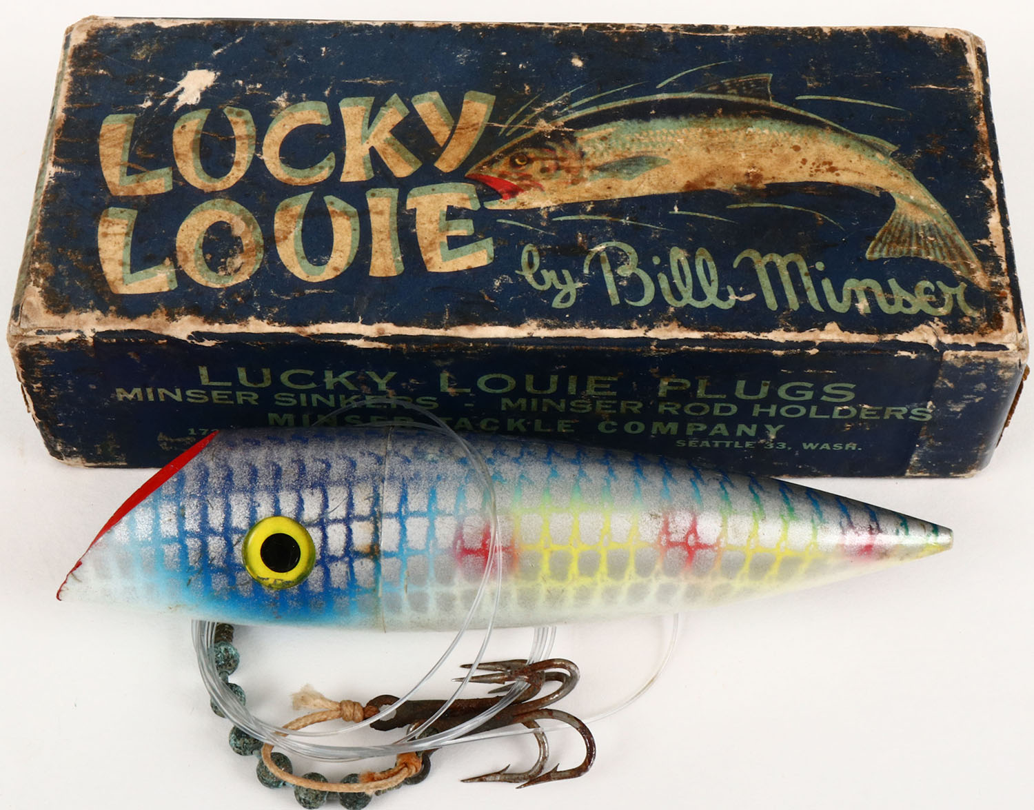 Lucky Louie Salmon Plug in the original box, CE, well marked, blue, yellow & gray scale with red spots, box shows wear. Grade: Excellent - Value: 10 to 30