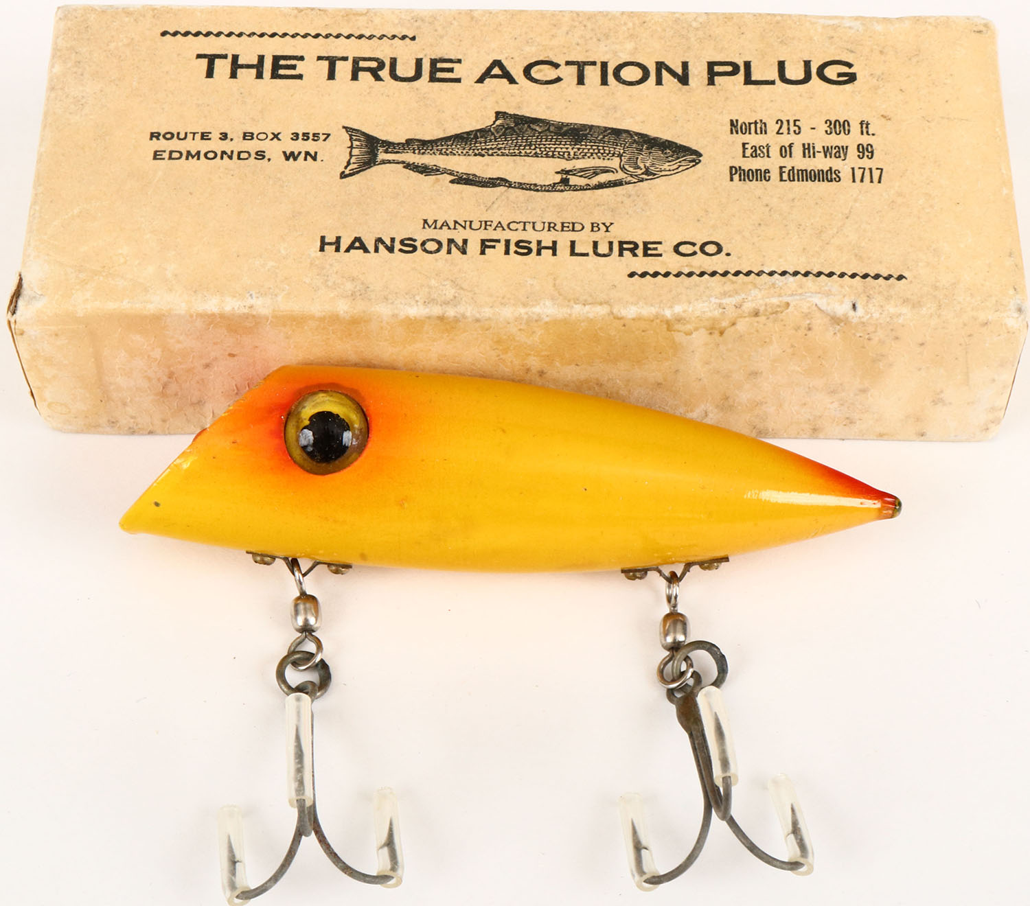 Hanson Salmon Plug in the original box, GE, well marked, yellow with red eyes. Grade: Excellent - Value: 10 to 30