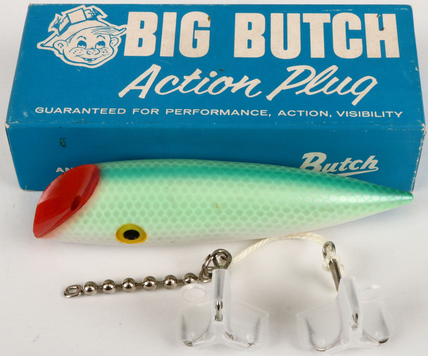 Big Butch Action Salmon Plug in the original box, CE, well marked, green & white scale. Grade: MINT - Value: 10 to 30