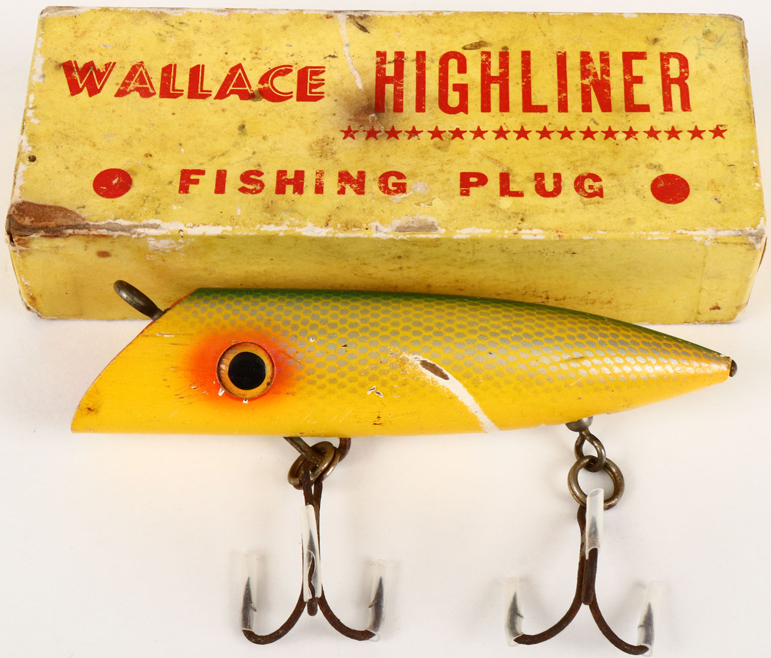 Wallace Highliner Salmon Plug in box marked pearl pink, CE, well marked, yellow & gray scale. Grade: Very Good + - Value: 4 to 20