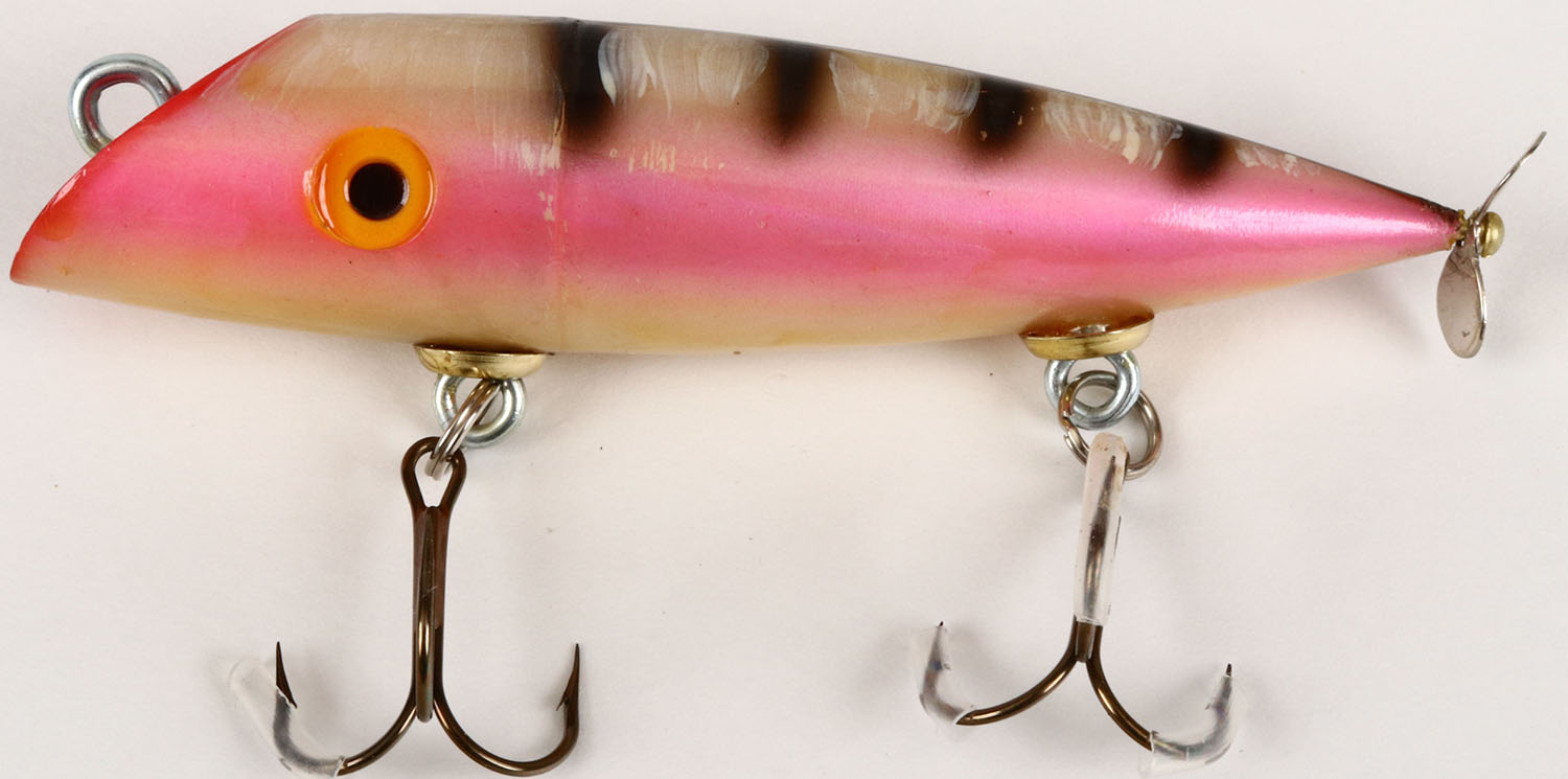 Unmarked Test Salmon Plug, CE, pearl pink with black stripes. Grade: Excellent + - Value: 10 to 40