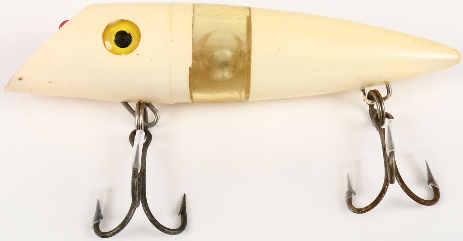 Neon Mickey Salmon Plug, GE, unmarked, mercury filled, white with red lip. Grade: Excellent + - Value: 10 to 30