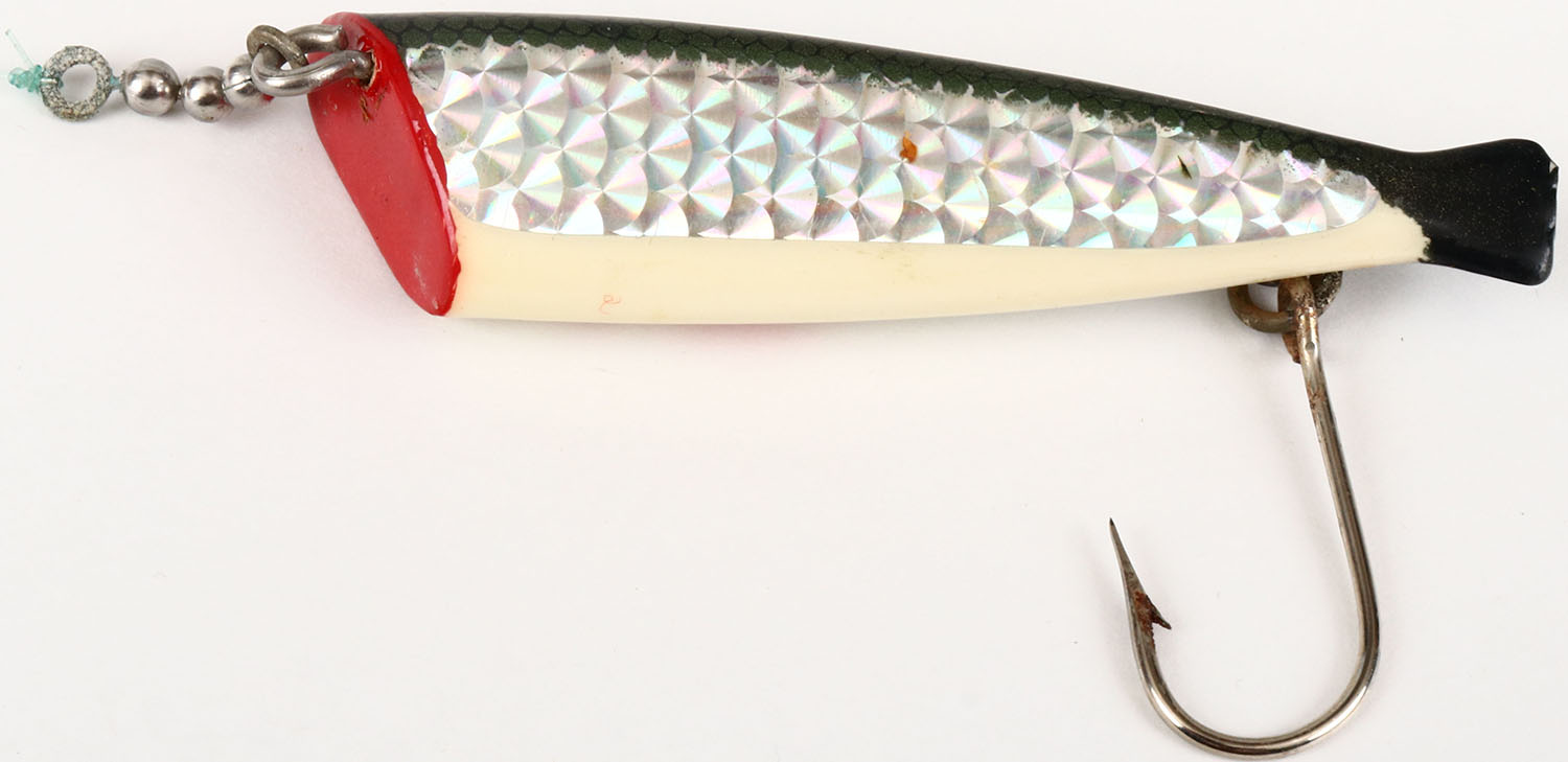 Cut Plug No 4 Salmon lure, green scale back with reflective silver sides. Grade: Excellent + - Value: 2 to 20