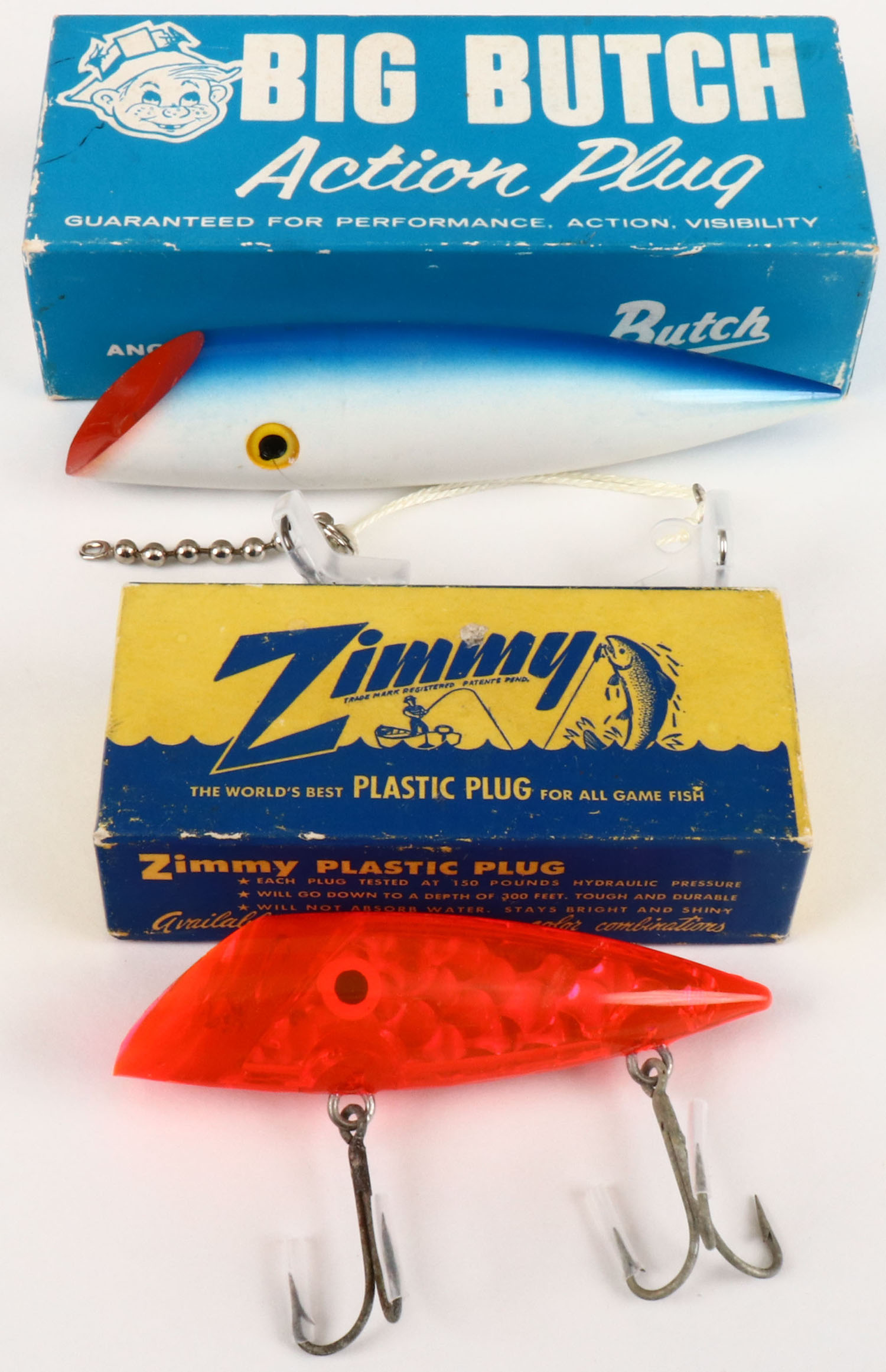 Lot of 2 Big Butch/Zimmy Salmon plugs in original boxes. Grade: Excellent + - Value: 10 to 60