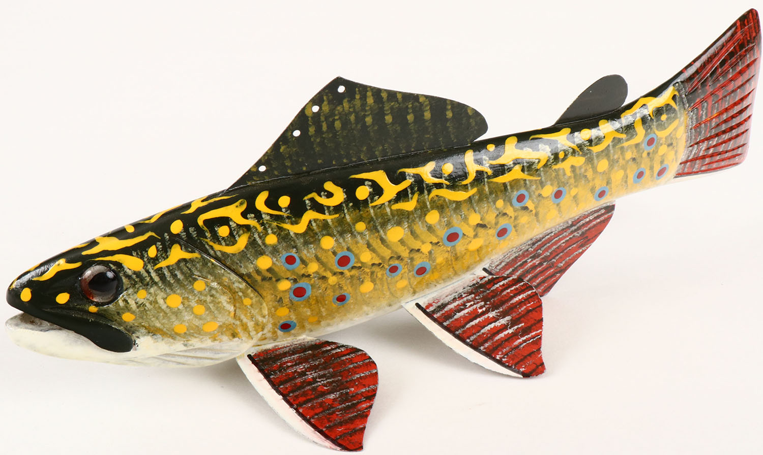 Carl Christiansen Ice Fishing Decoy, Brook Trout, GE, Signed C.C. on bottom, has 7 metal fins, 8'' OAL. Grade: MINT - Value: 50 to 200