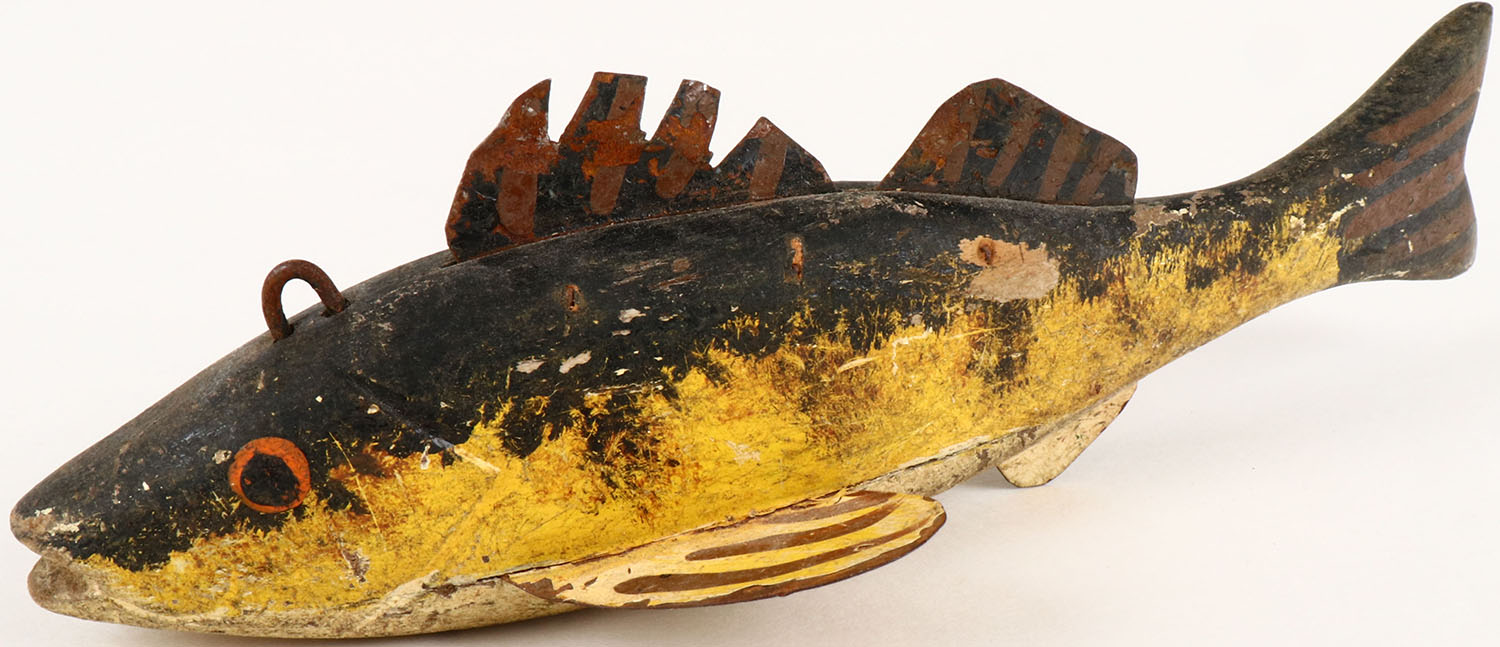 Unmarked Ice Fishing Decoy, Yellow Perch, PE, has 4 metal fins, 6'' OAL. Grade: Very Good + - Value: 10 to 60