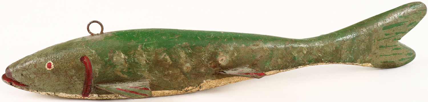 Unmarked Ice Fishing Decoy, PE, green paint, has 4 metal fins, 8 1/2'' OAL. Grade: Very Good + - Value: 10 to 60