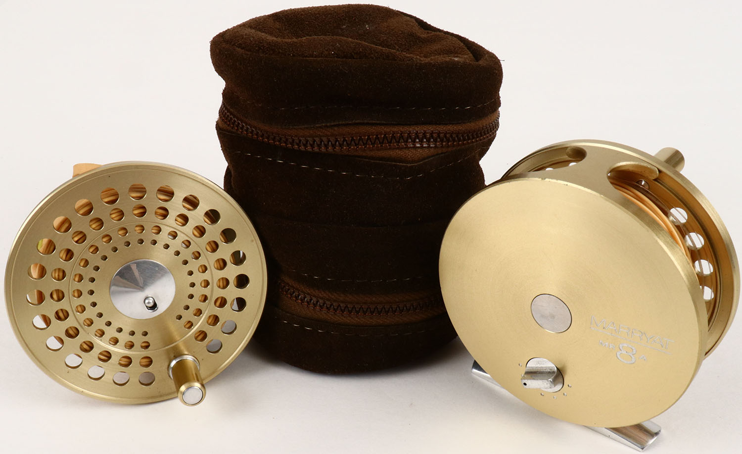 Marryat MR8A Fly reel with extra spool & leather pouch, 3'' in dia., has 3 wt. fly line. Grade: Excellent - Value: 30 to 100