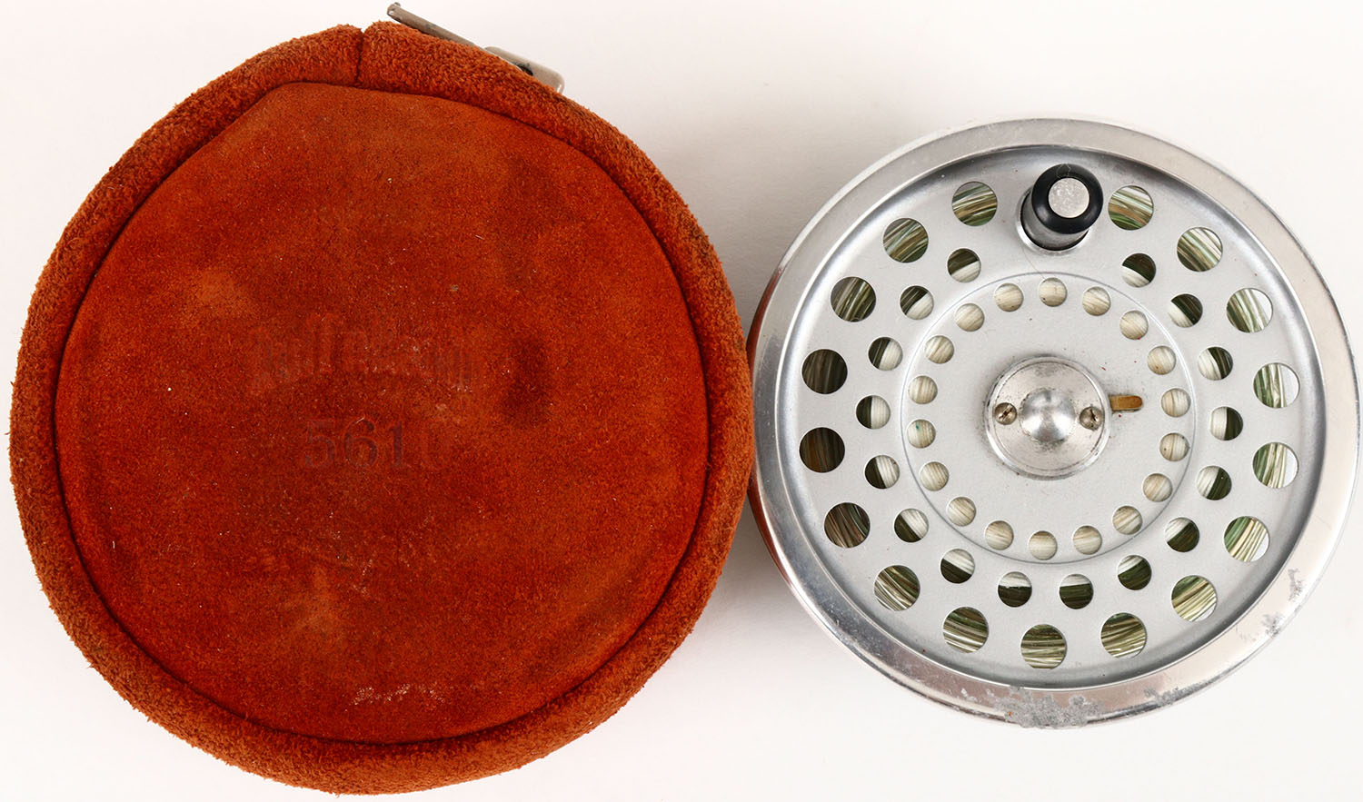 Hardy Bros. Fly Reel Spool, shows some wear, 3 1/2'' dia., has original leather pouch. Grade: Very Good ++ - Value: 20 to 100