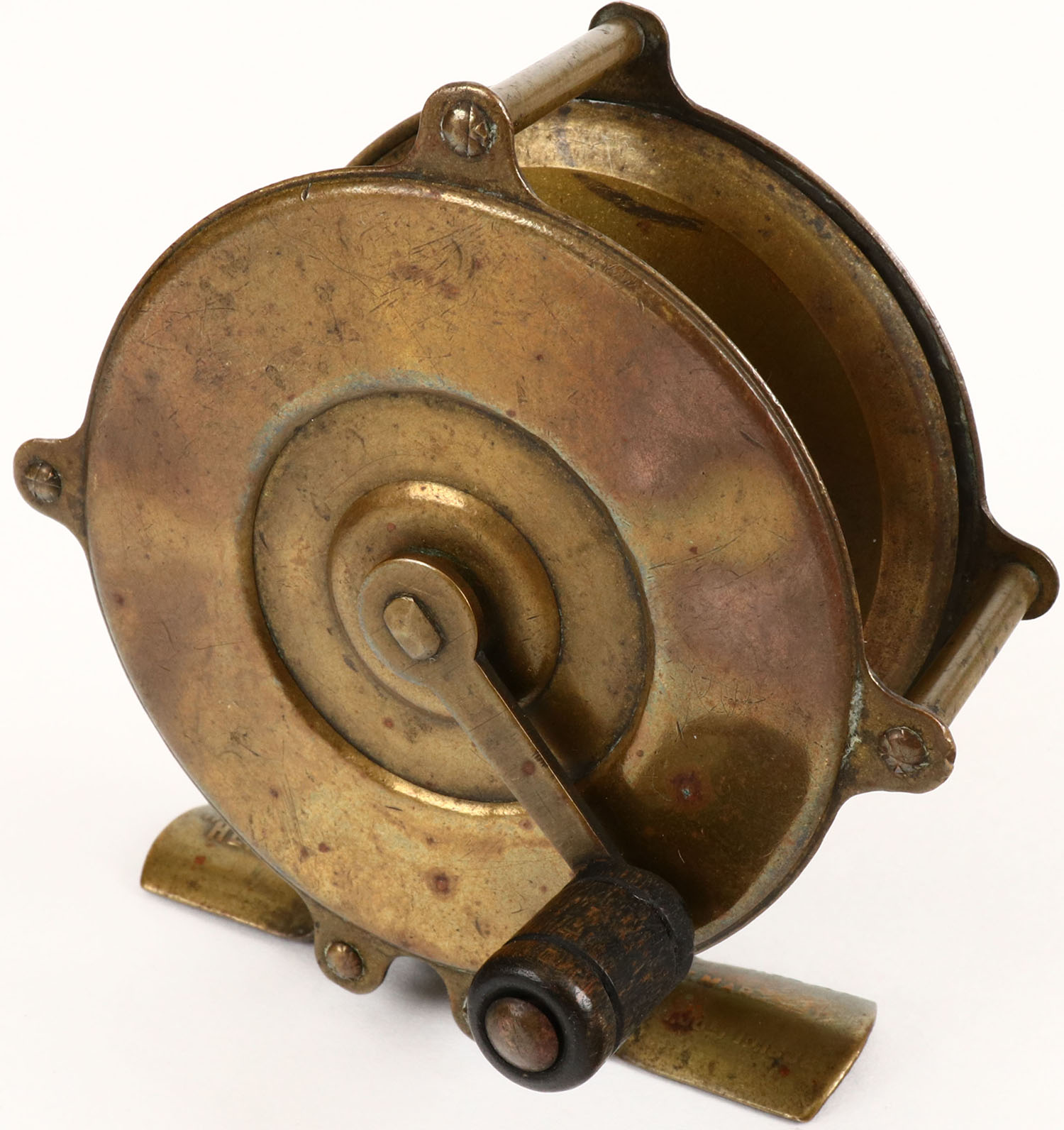 Hendryx Brass Fly Reel, marked on reel seat, 150 on bottom, has wood handle. Grade: Excellent - Value: 30 to 100
