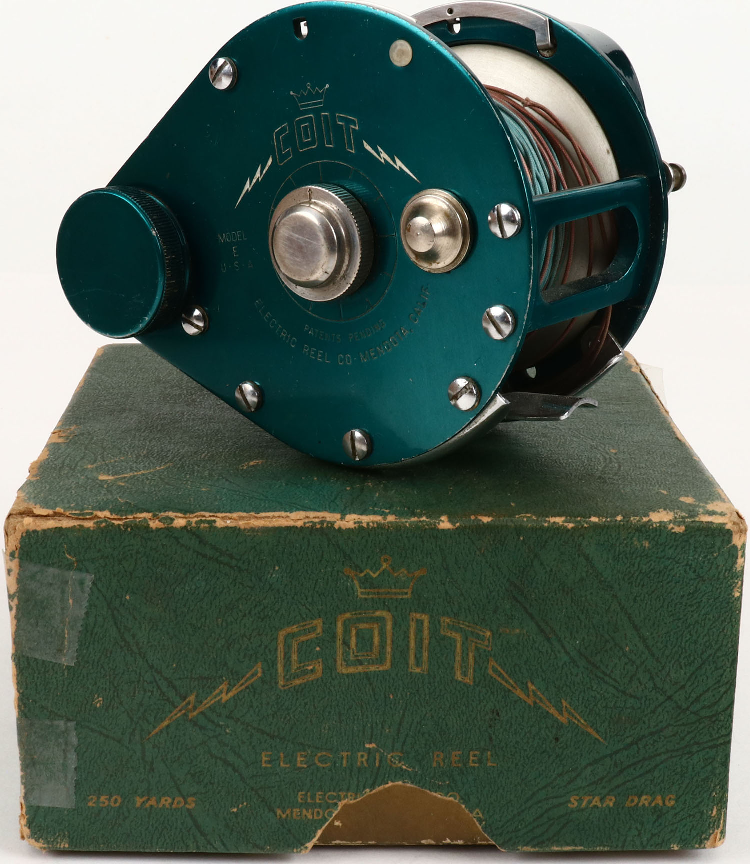 Colt Electric Reel Model E, in the original box, has spot of a ''C'' battery, has paperwork, box has one tape repair, reel is very nice. Grade: Excellent - Value: 30 to 250