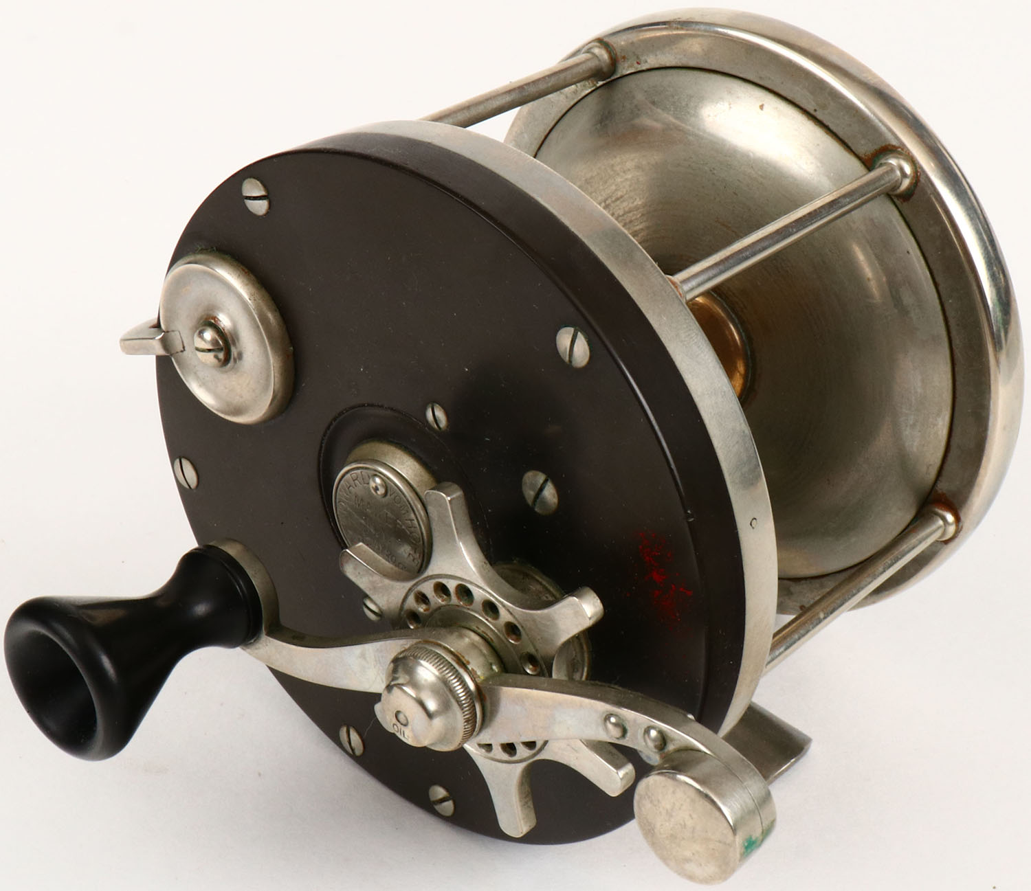 Edward Vom Hofe fishing reel, Model 621 6/0, Pat. May 20, 1902, 4 1/4'' dia., has leather thumb break. Grade: Excellent - Value: 100 to 300