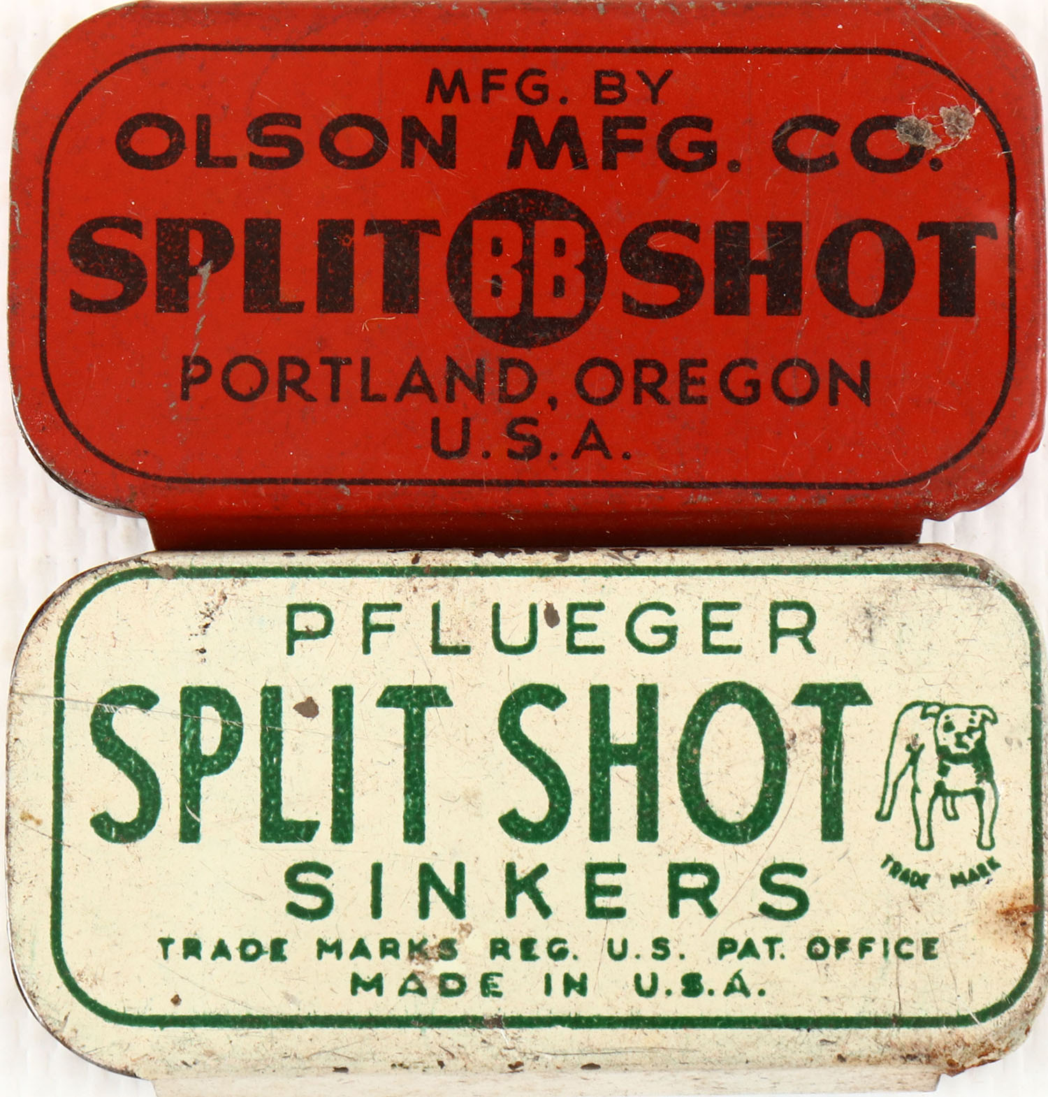 Lot of 2 Split Shot Tins by Pflueger & Olson. Grade: Excellent - Value: 6 to 20