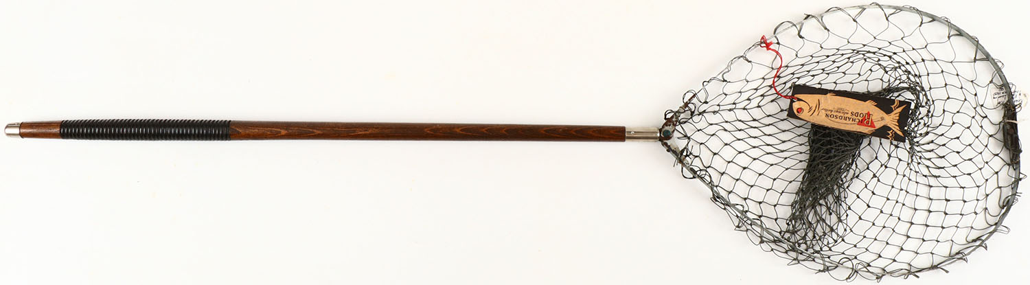 Richardson collapsible fishing net, 1pc, 16'' net with 30'' hickory handle, has hang tog that is for another size net but nice graphics. Grade: Excellent - Value: 20 to 100