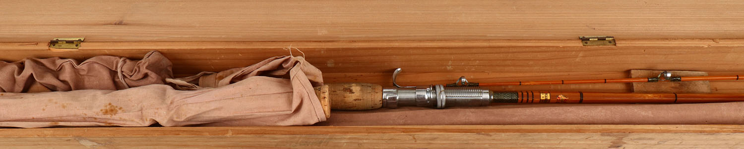 Set of 3 Bamboo rods from Kiraku & Co. Tokyo Japan in original wood box, has one surf rod, one fly rod & one casting rod, has 2 original cloth bags (one missing), all has very nice original labels on base of rods, wood shipping box is missing both wood ends. Grade: Very Good ++ - Value: 20 to 200