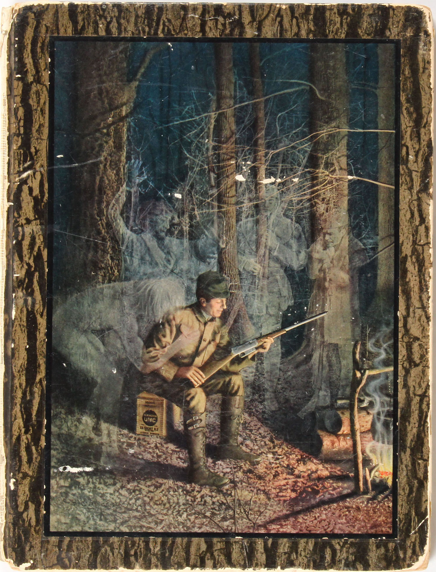 RARE!!! UMC & Co. ''A New Chapter in an Old story'' 1912. 8'' x 10 1/4''. A story on the evolution of arms and ammunition from prehistoric man to modern 1900s. Cover has scuffing but shows a military man with Remington UMC rifle & the ghostly images of fallen comrades surrounding him in the forest. Each page has light forest scene background & pages are very clean. The imagedry of the , binding intact. Grade: Very Good ++ - Value: 50 to 500
