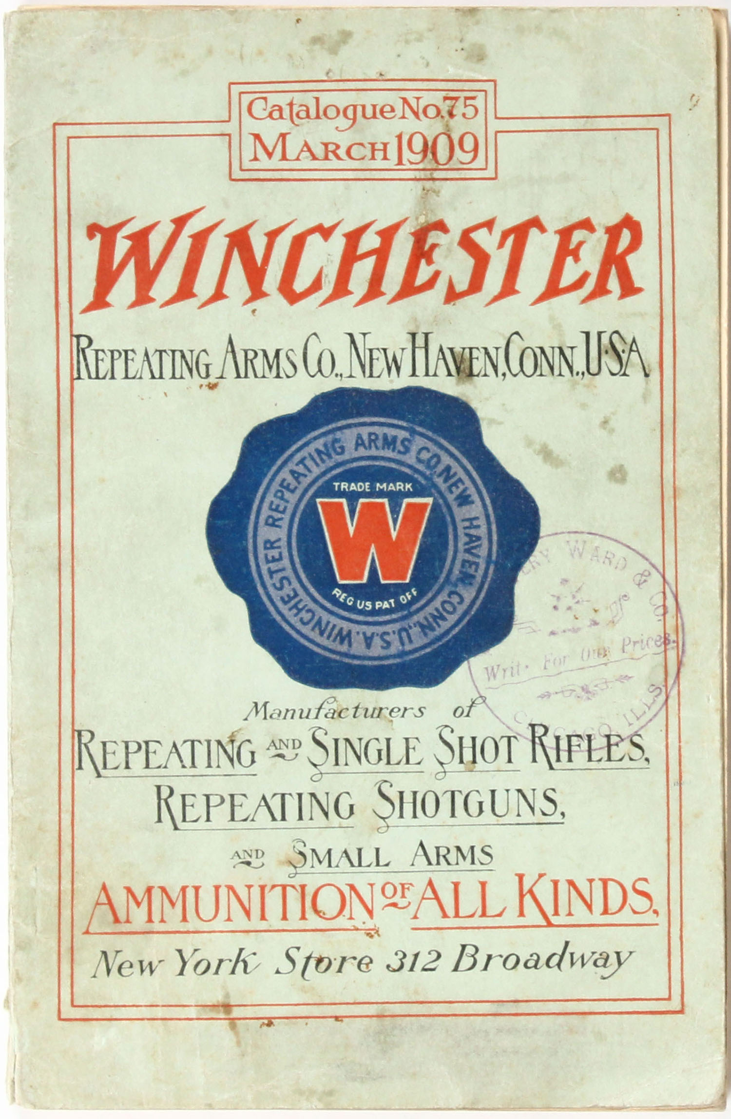 RARE! Winchester Repeating Arms Co. New Haven, Conn., U.S.A. Catalogue No. 75 March 1909 Price List of Winchester Repeating Rifles, Carbines And Muskets, Repeating Shotguns, Single Shot Rifles. Metallic Cartridges, Paper and Brass Shot Shells, Gun Wads, Primers, Percussion Caps, Loaded Shot Shells, ECT. 5 1/2'' x 9''. 182 pages, front cover is not attached to pages but binding is tight, pages clean, softcover good. Grade: Very Good + - Value: 2 to 100