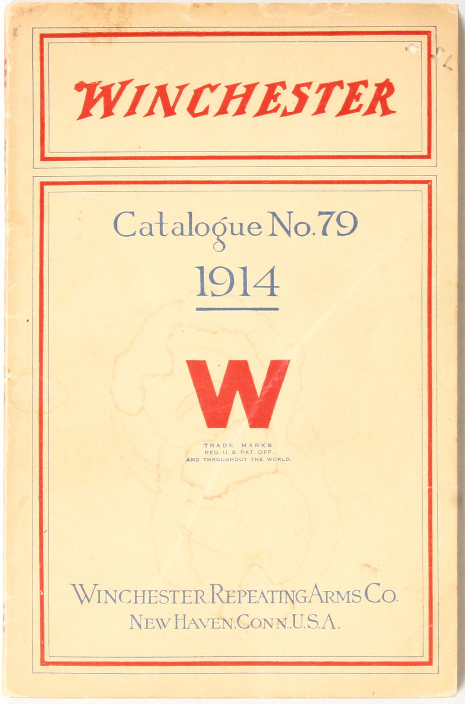 Winchester Catalogue No. 79, 1914, 224 pages, includes repeating rifles, carbines and muskets, repeating shotguns, single shot rifles, metallic cartridges, paper and brass shot shells, gun wads, primers, percussion caps, and loaded shot shells, etc. 5 1/2'' x 8 1/4''. Pages clean, b/w images, cover has watermarks, binding tight. Grade: Excellent - Value: 2 to 200