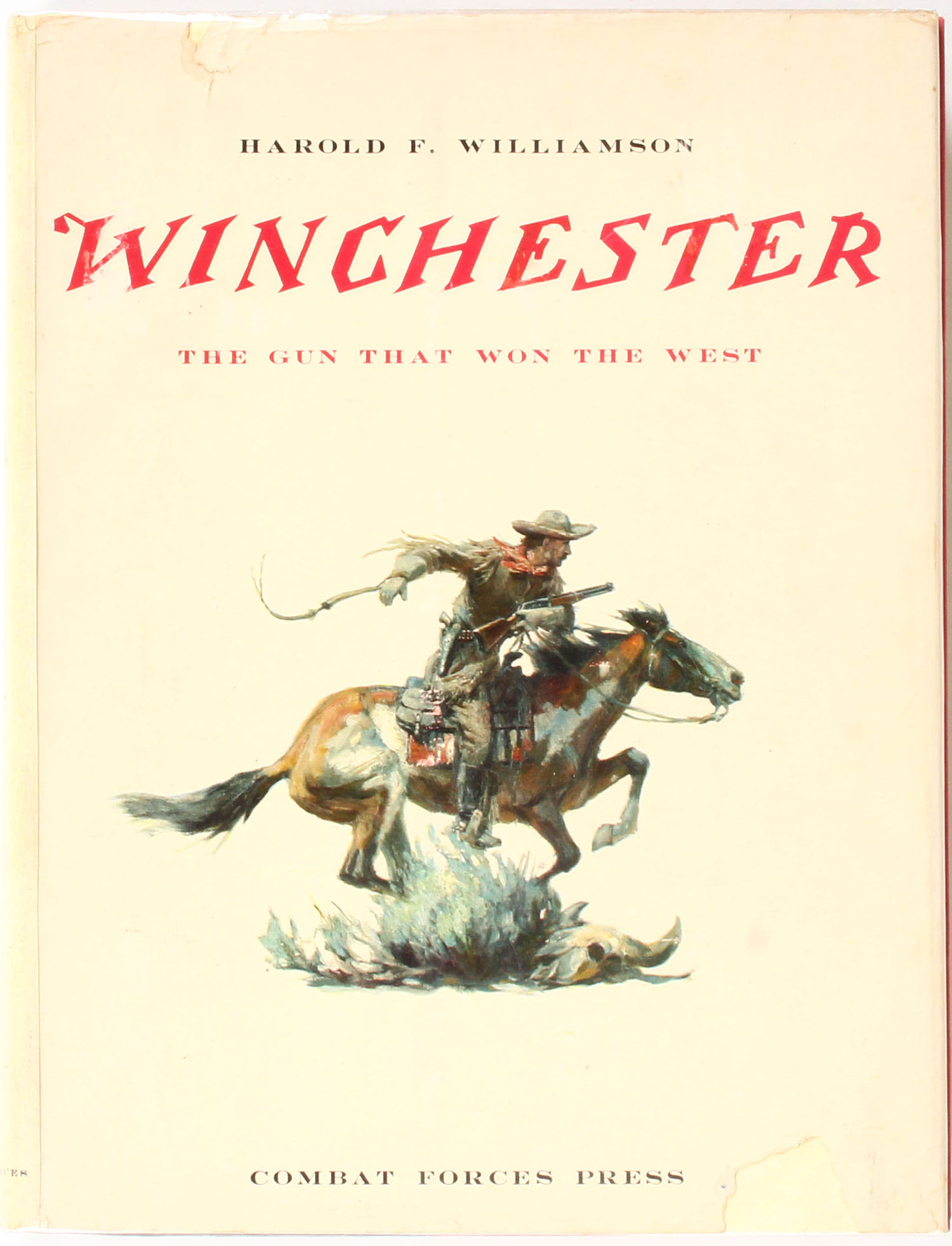 Winchester: The Gun that Won the West by Harold Williamson, 8 1/2'' x 11''. 494 pages, pages clean, binding tight, hardcover and dustjacket good with some stains on the dustjacket, B/W images. Grade: Excellent + - Value: 2 to 200