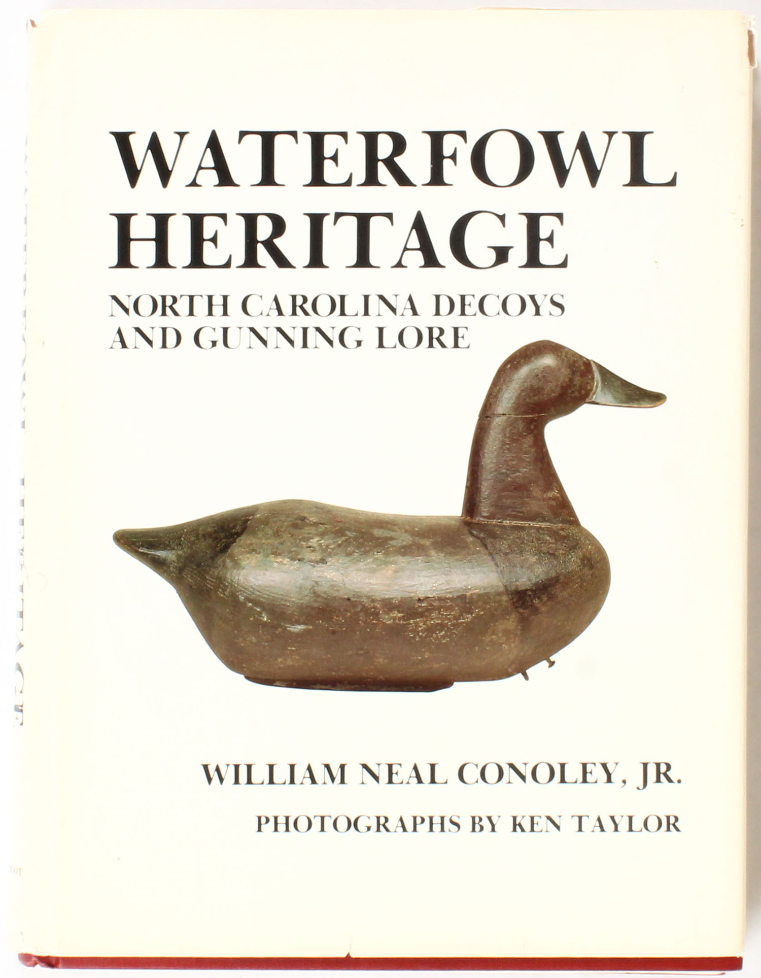 Waterfowl Heritage: North Carolina Decoys and Gunning Lore by William Neal Conoley, JR. 9 1/2'' x 12''. 324 pages, pages clean, binding tight, hardcover very good, dustjacket has some tearing. Grade: Very Good +? - Value: 100 to 300