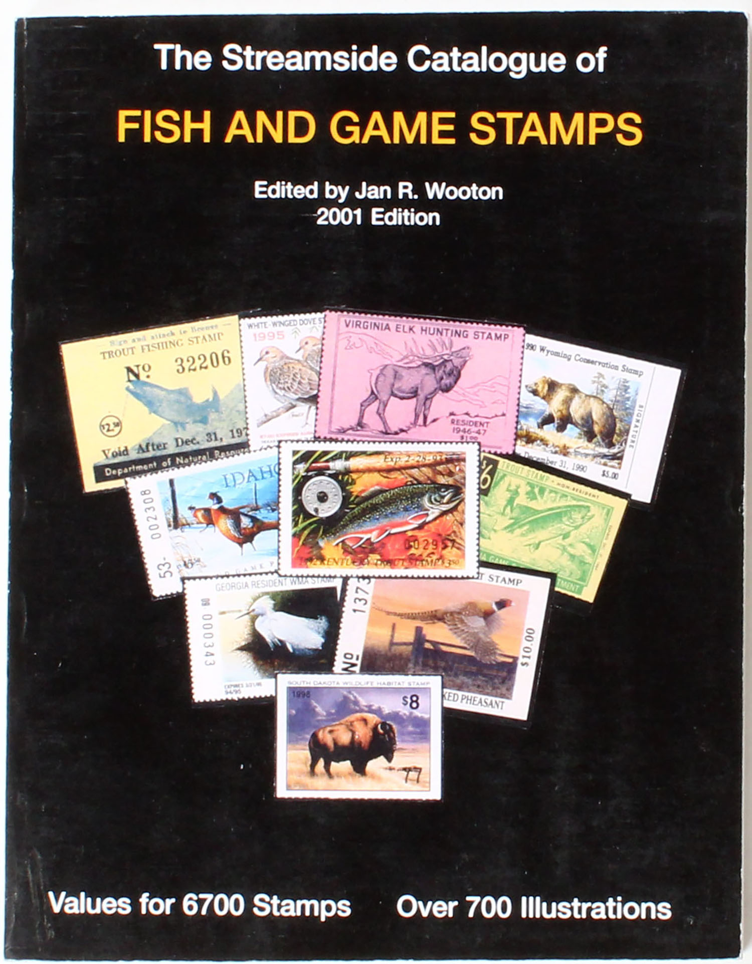 The Streamside Catalogue of Fish and Game Stamps Edited by Jan R. Wooton 2001 edition, values for 6700 stamps over 700 illustrations, 8 1/2'' x 11''. 210 pages, pages clean, binding tight, softcover excellent. Grade: Excellent ++ - Value: 2 to 100