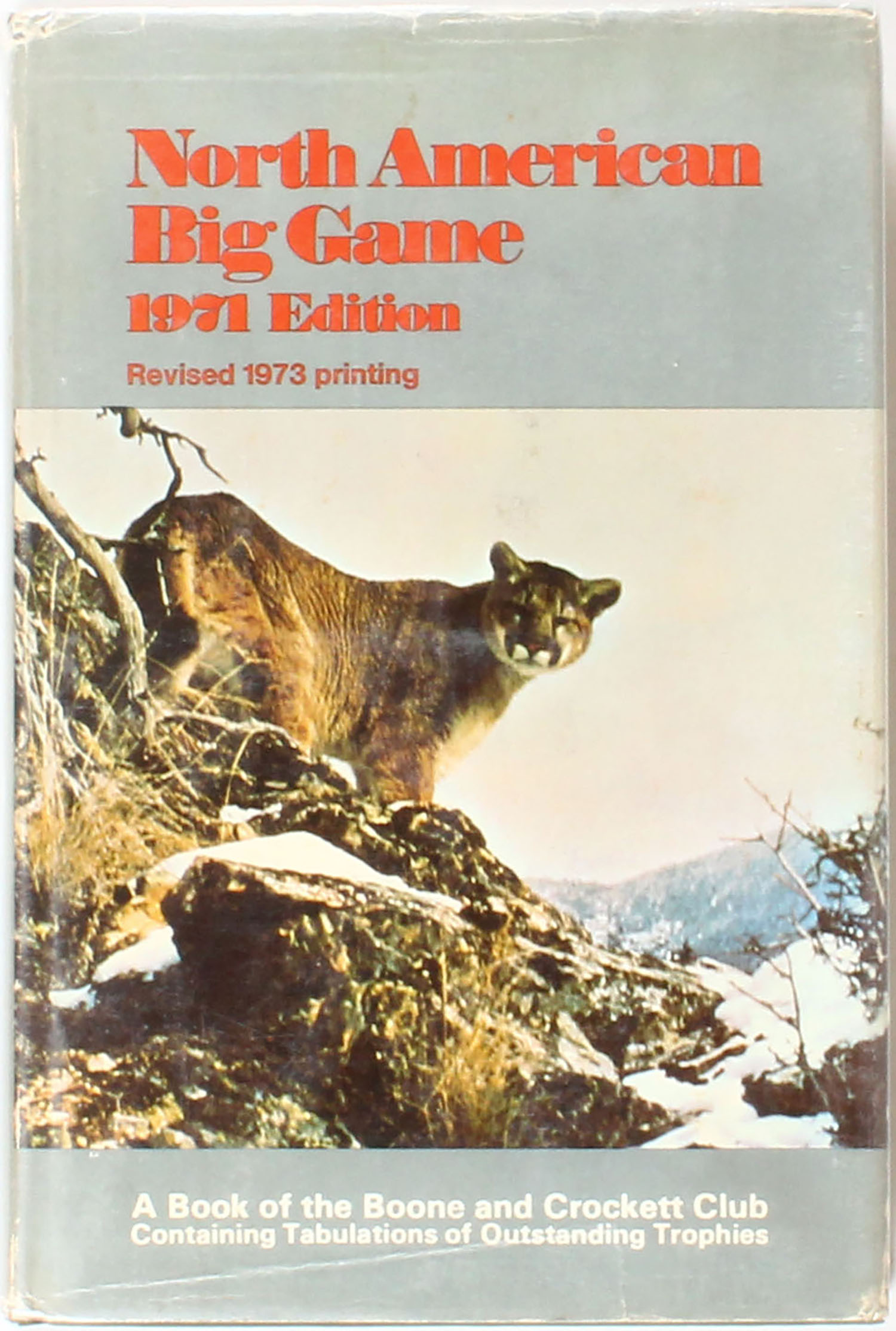 North American Big Game 1971 Edition Revised 1973 printing A Book of the Boone and Crockett Club Containing Tabulations of Outstanding Trophies, 6 1/2'' x 9 1/2''. 403 pages, pages clean, binding tight, hardcover and dustjacket very good, B/W images. Grade: Very Good + - Value: 2 to 100