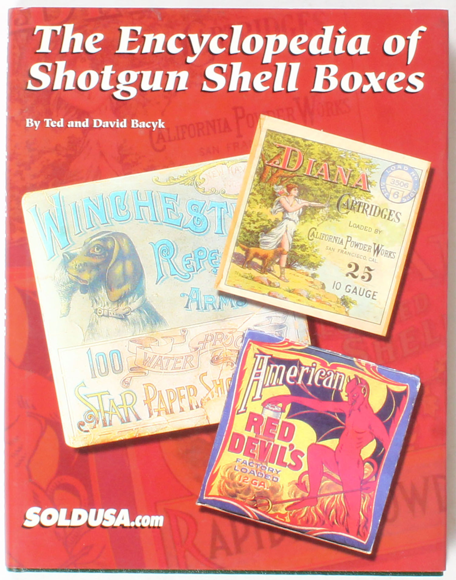 The Encyclopedia of Shotgun Shell Boxes by Ted and David Bacyk 2000, 8 1/2'' x 11''. 212 pages, pages clean, binding tight, hardcover and dustjacket mint, colored images. Grade: Excellent + - Value: 2 to 200