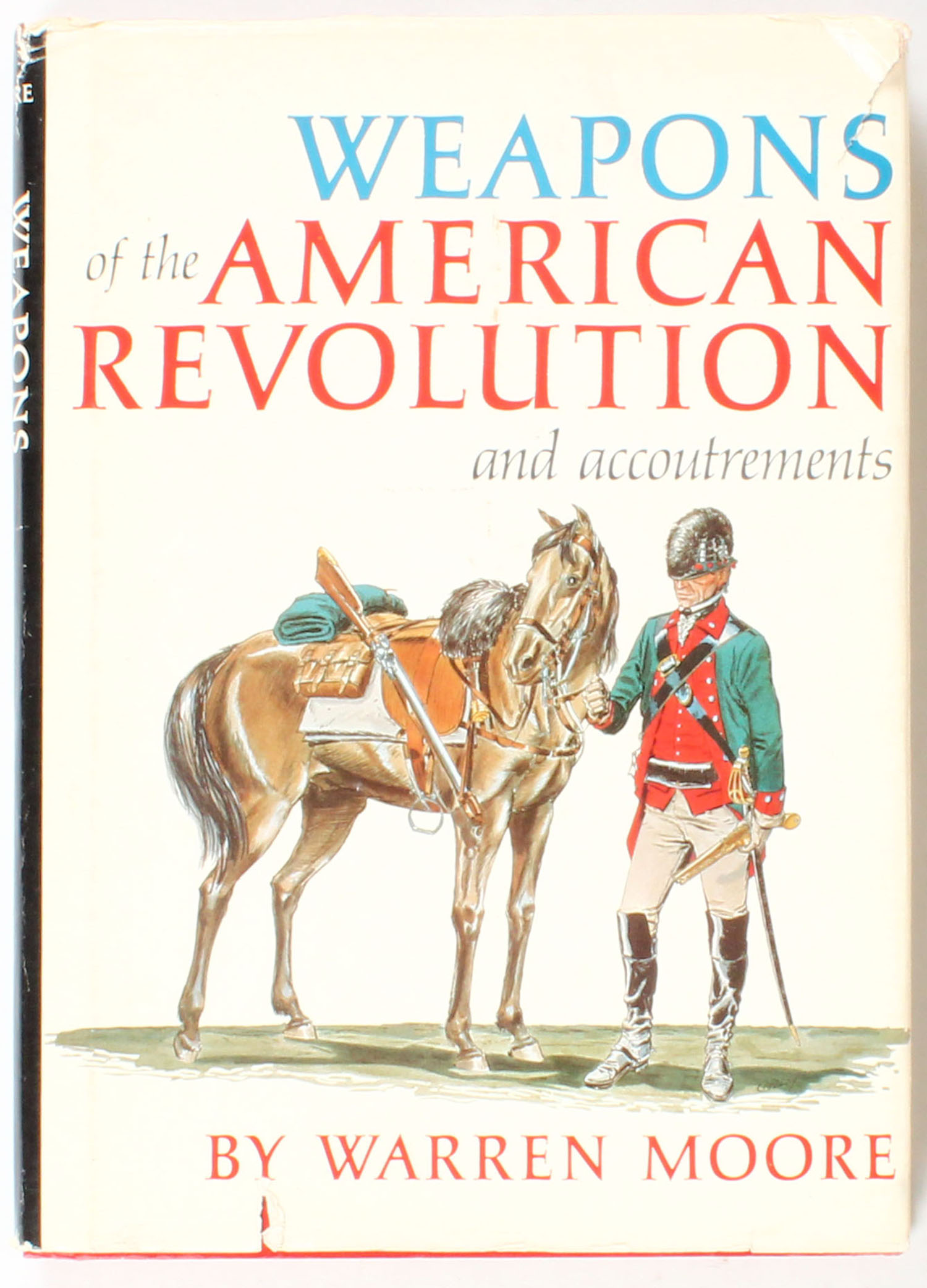 Weapons of the American Revolution and accoutrements by Warren Moore 1967, 8 1/2'' x 12''. 225 pages, pages clean, binding tight, hardcover and dustjacket good, dustjacket has some tears, B/W and colored images. Grade: Very Good ++ - Value: 2 to 40