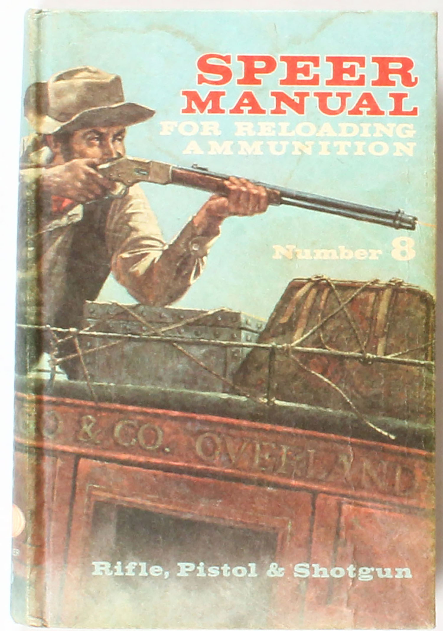 Speer Manual for Reloading Ammunition Number 8, 1970, 5 1/2'' x 8 1/4'', 448 pages. Hardcover very god some creasing on binding and some fading, b/w images, pages clean. Grade: Excellent - Value: 2 to 60