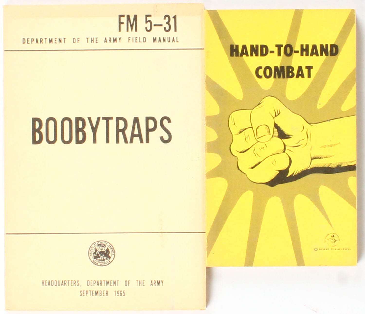 Lot of 2 Handbooks (1) Boobytraps Department Of The Army Field Manual FM 5-31 5 1/2'' x 8 1/2''. (1) Hand-To-Hand Combat 4 1/2'' x 7''. Both paperback very good. Grade: Very Good + - Value: 2 to 60