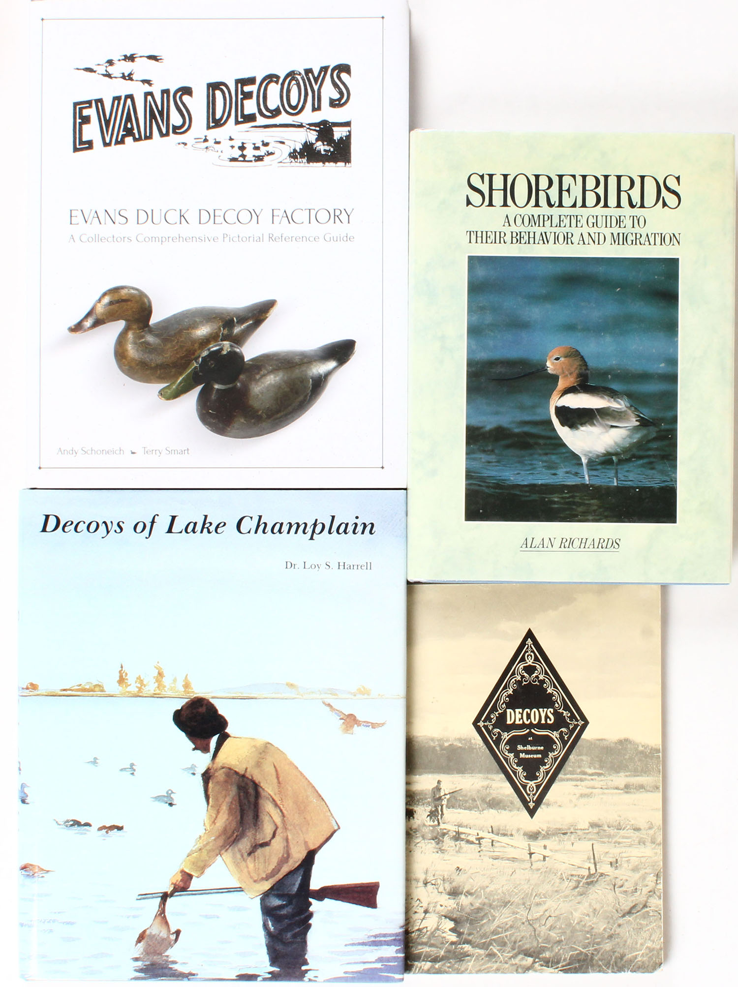 Lot of 4 Decoy books (1) Decoys of Lake Champlain by Dr. Loy S. Harrell (1) Evans Decoys - Evans Duck Decoy Factory A Collector's Comprehensive Pictorial Reference Guide by Andy Schoneich and Terry Smart (1) Shorebirds A Complete Guide To Their Behavior and Migration by Alan Richards (1) Decoys at Shelburne Museum 1961 by David S. Webster and William Kehoe. Grade: Very Good ++ - Value: 6 to 60