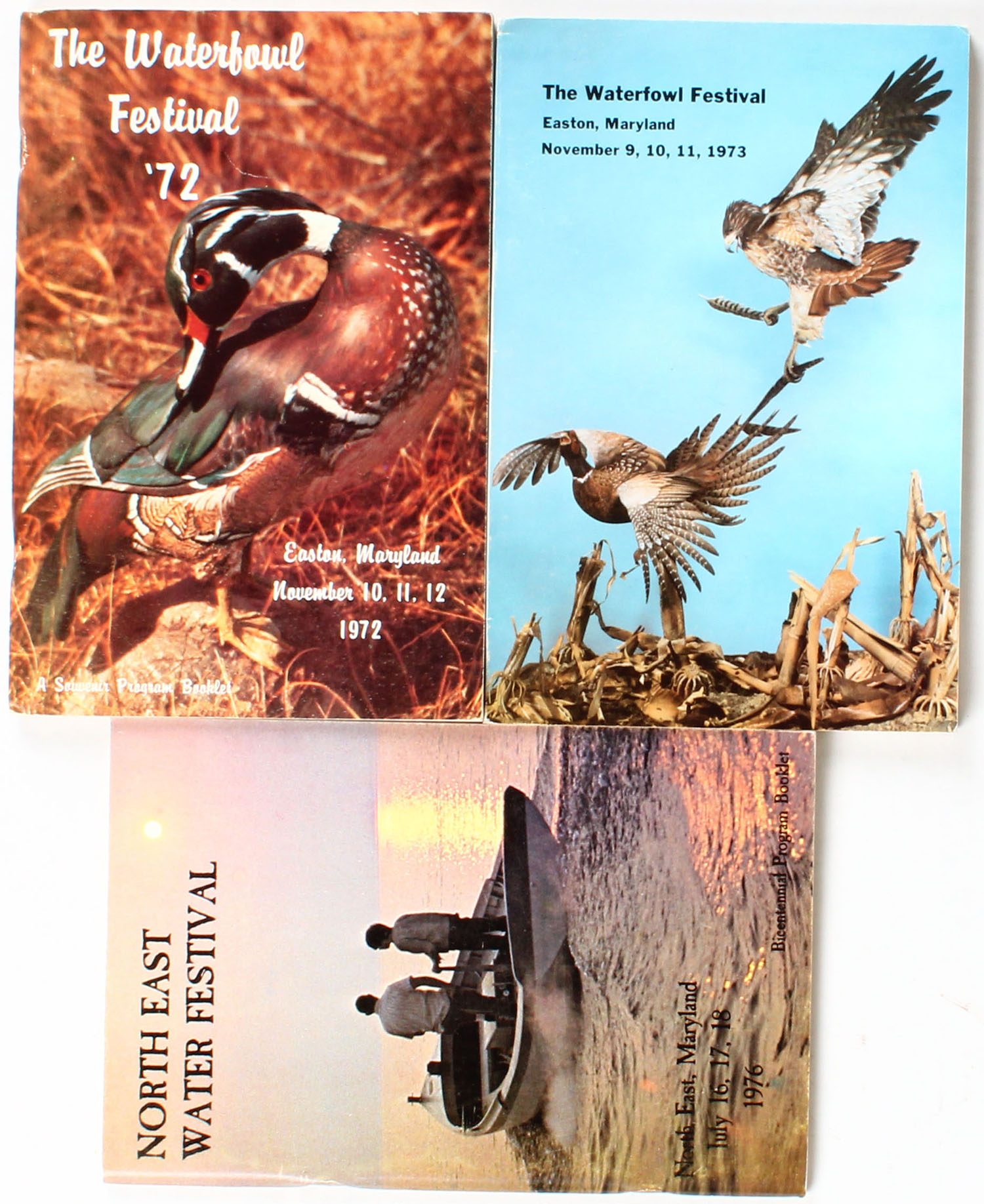 Lot of 3 (1) The Waterfowl Festival '72 Easton Maryland November 10.11.12 1972 (1) The Waterfowl Festival Easton, Maryland November 9,10,11, 1973 (1) North East Water Festival North, East, Maryland July 16, 17, 18 1976. all 6'' x 9''. Softcovers very good, pages clean, bindings tight. Grade: Very Good ++ - Value: 2 to 100