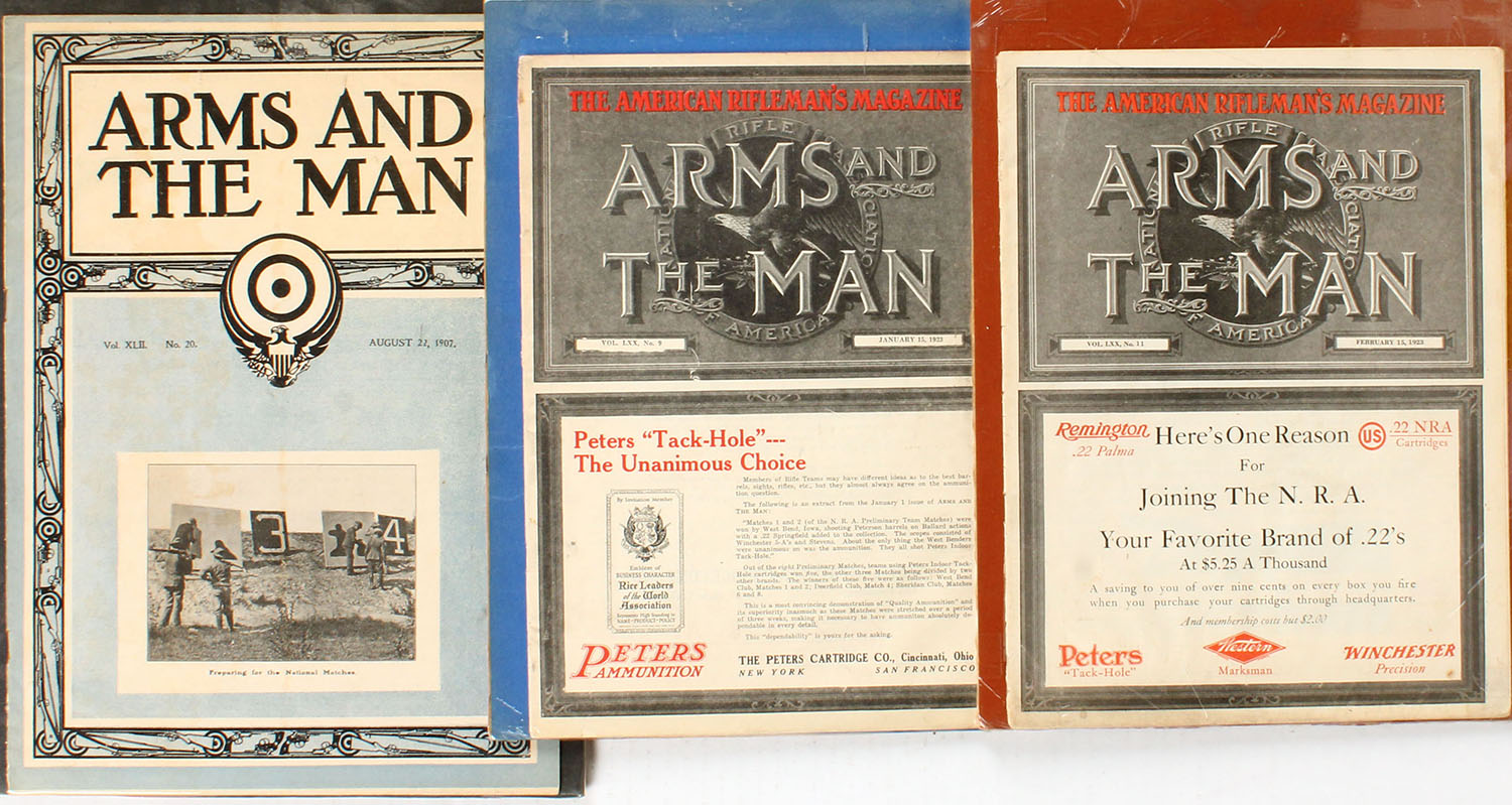 Lot of 3 The American Rifleman's Magazine Arms and The Man from 1907 to 1923, sealed and shrink wrapped onto cardboard to preserve, largest is 9 3/4'' x 14''. Staple binding intact, some discoloring on covers from age. Grade: Excellent - Value: 2 to 100