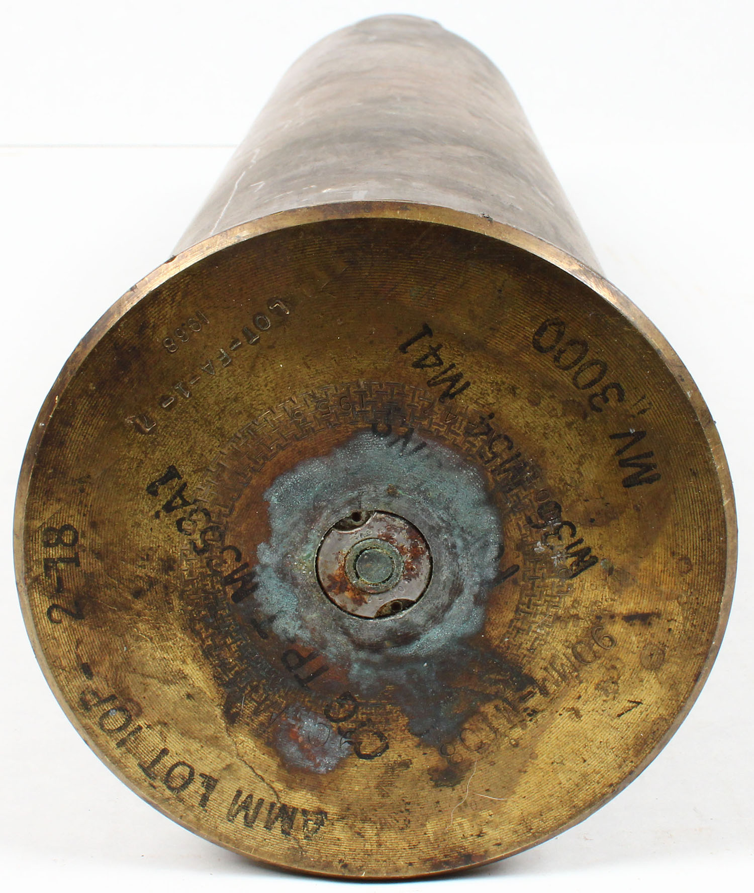 Military shell, H/S ''90MM-M108'', ''90 MM T24'', ''LOT-FA-1-7'', ''1968'', ''AMM LOT IOP- 2-18'', ''CTG TP-T-M353A1'', ''M35 M54 M41'', ''MV 3000'', OAL- 23 3/4''. Grade: Very Good + - Value: 10 to 100